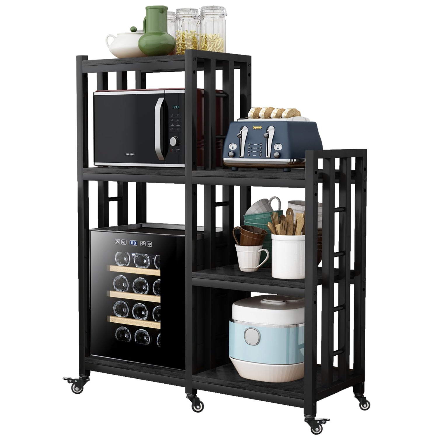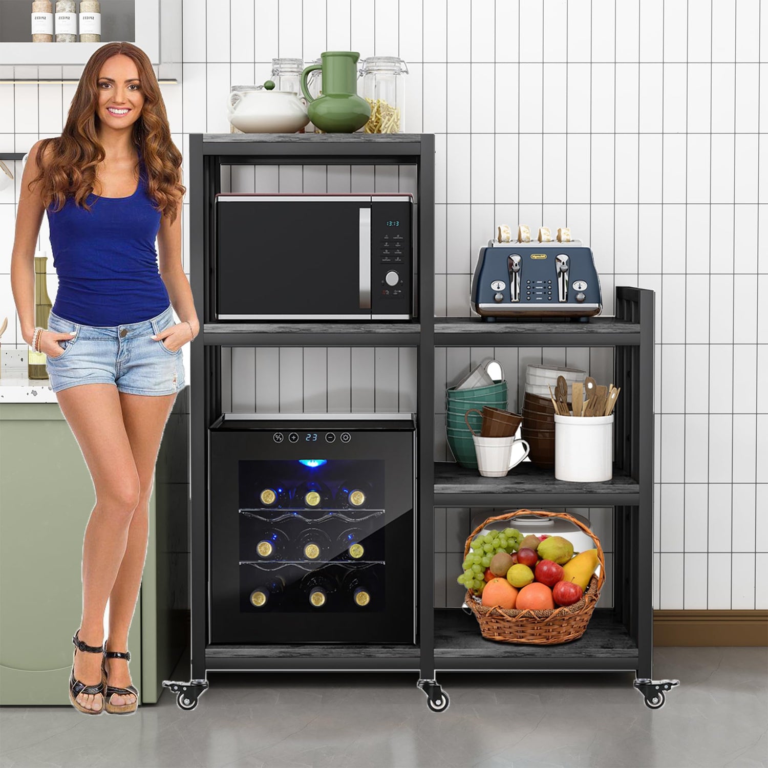 6-Tier Kitchen Bakers Rack, Multifunctional Storage Shelf, Mini Fridge & Microwave Oven Stand Table, Coffee Bar, Adjustable Kitchen Shelves Freestadning (Charcoal Black Wood Grain Print with wheels)