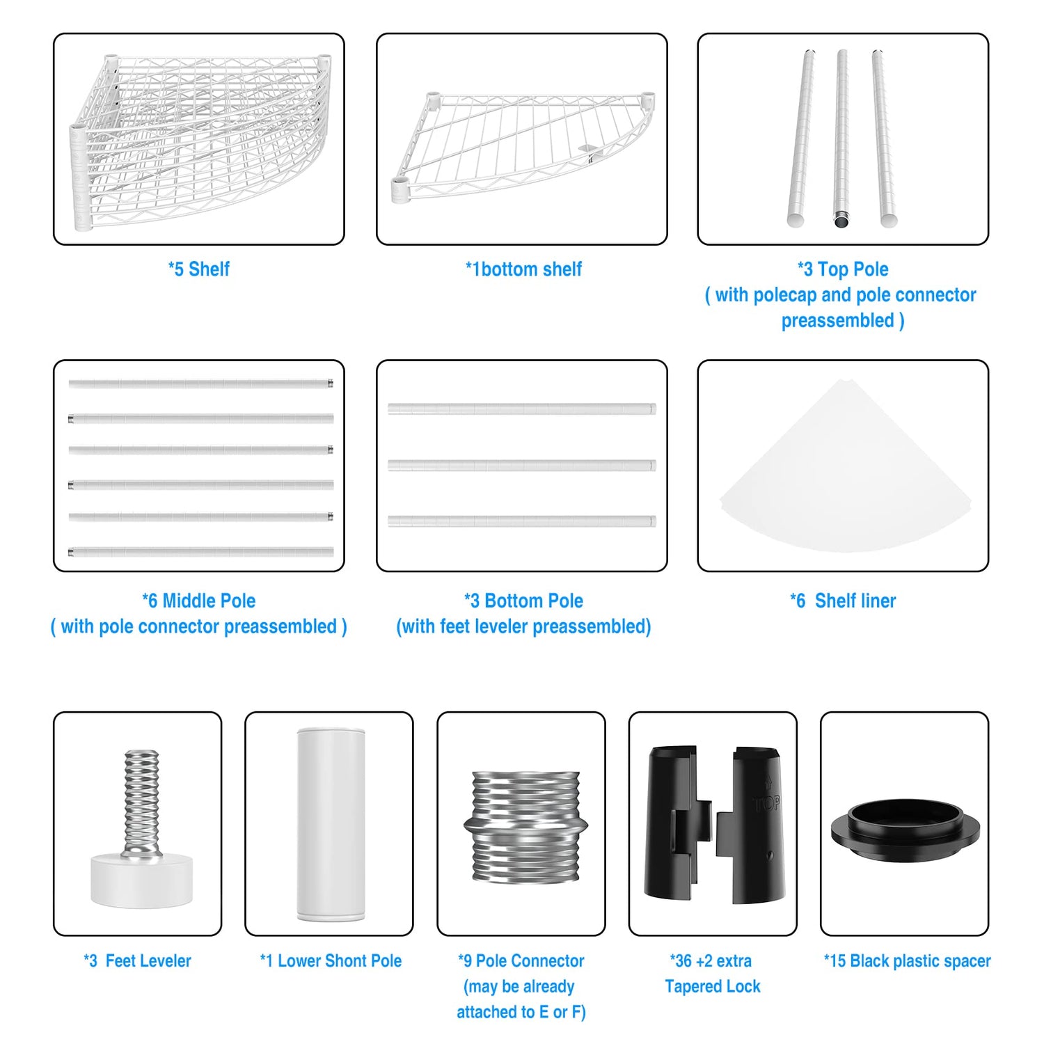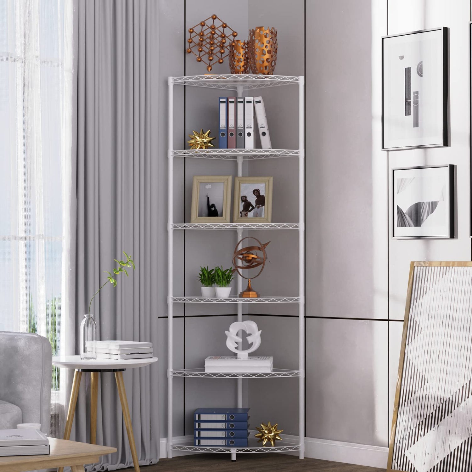 - [SUTABLE FOR INSTALLATION IN THE CORNER] - Our 6-story triangular storage rack is very suitable for placing in the corner, especially for places where space is limited and requires large storage space. Simple modern design is well coordinated with any family and store decoration style. For example, bathroom, door, entrance, garage, kitchen, kitchen, laundry room, office or closet.