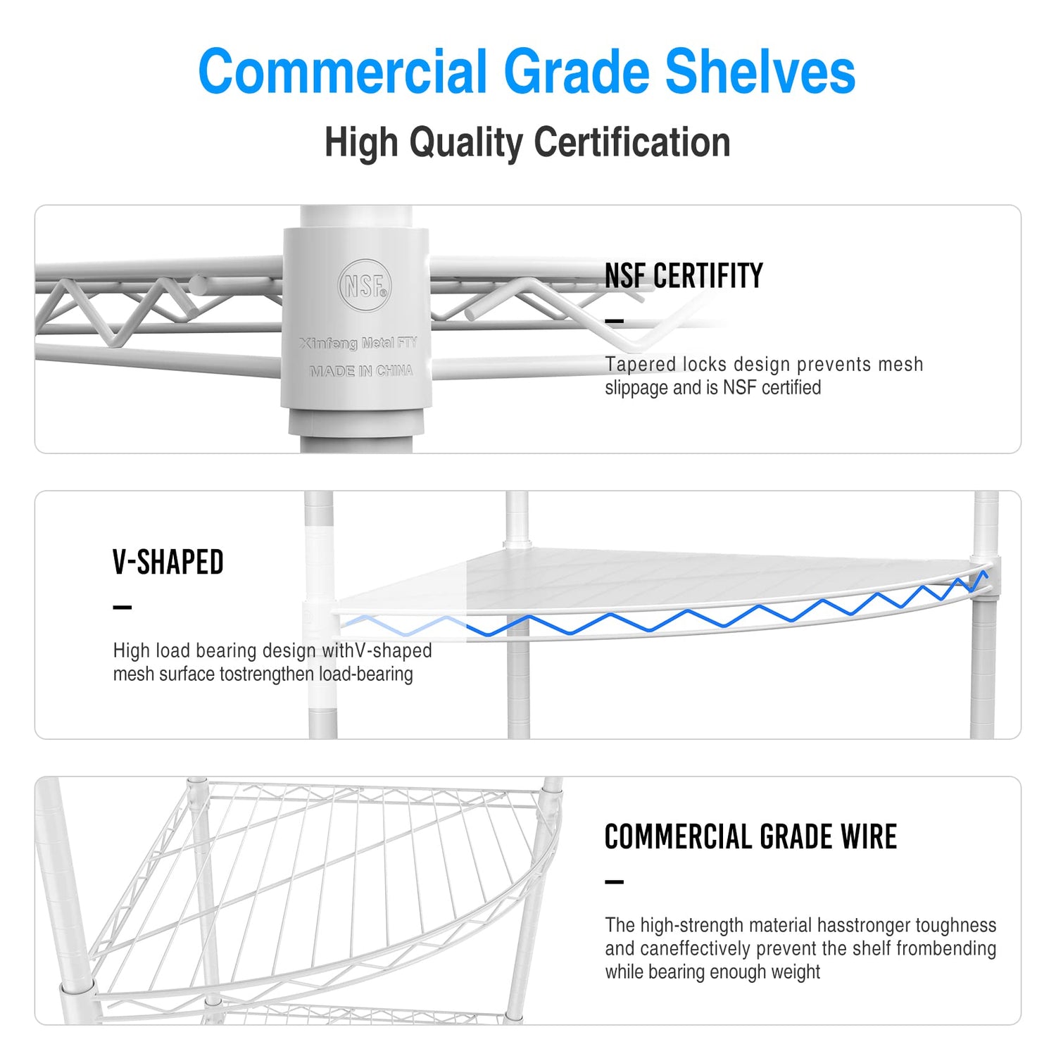 - [EXTREMELY DURABLE] - Wire shelving made of heavy steel, it has excellent rust resistance and oxidation resistance. Our wire shelf liner is crafted to provide unparalleled quality, longevity, function and beauty. Better quality thicker than the competition. The 6 tier shelf unit passed NSF certified, safe and reliable. Storage rack are perfect addition to home, office.