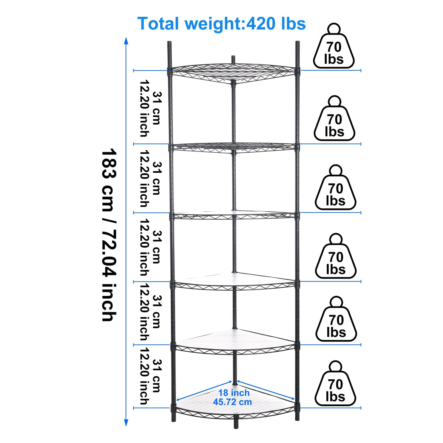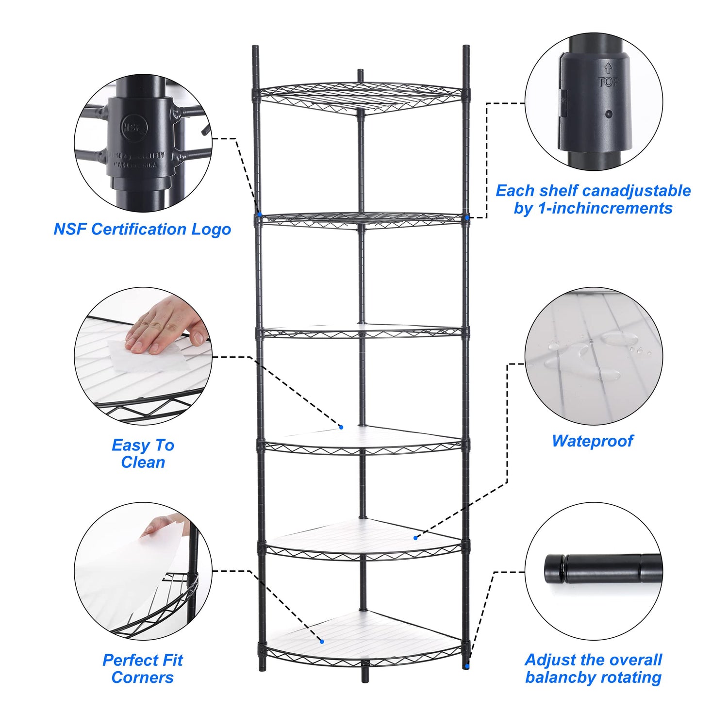 6 Tier NSF Metal Corner Shelf Wire Shelving Unit, 420lbs Capacity Heavy Duty Adjustable Storage Rack with Shelf Liners for Closet Kitchen Bathroom Garage Basement, 72" H x 18" L x 18" D - Black