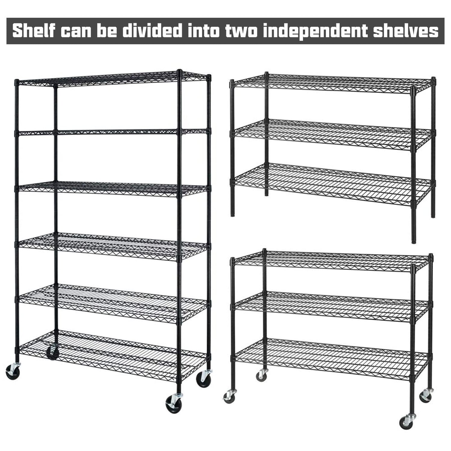Details: Dlewmsyic 6 Tier Storage Shelves, 5999 Lbs Capacity Metal Shelf with Wheels Height Adjustable NSF Certification 48" L×18" W×76" H Heavy Duty Wire Shelving Units for Garage Pantry Kitchen Rack, Black(1) Excellent load-bearing performance: ◆The shelving unit is NSF certified for storage and heated environments.◆When evenly distributed on feet levelers, the maximum load capacity of each shelf is 1000 pounds, and the whole weight limit is 5999 pounds. ◆When evenly distributed on the casters, the maximum load capacity of entire unit is 600 pounds. (2) Wheels & Leveling Feet: ◆The nylon casters have brakes for easy movement and fixation,while the leveling feet can help with stabilize. ◆The black coating is more resistant to kitchen fumes than other colors, and the surface is smooth and easy to clean. (3) ITEM DETAILS: ◆Dimensions: 48"L x 18"W x72"H (With stationary feet) ◆Dimensions: 48"L x 18"W x76"H (With Wheels) ◆Main Colour: Black (4) In the Package: ◆Shelf x 6 ◆Caster x 4 (2 of the casters have locking mechanisms) ◆Wrench x 1 ◆Other Accessories ·Easy to assemble without any other tools. All necessary accessories are included in the package. ◆No screws are involved, so it is completely safe as furniture. No chemical odor, durable. WE PROMISE◆Delivery Time: 3-7 days◆Dlewmsyic TEAM: Our Metal Storage Shelves with Wheels Provide 2 years warranty, aim to give a better shopping experience to our customers. Please rest assured to buy!
