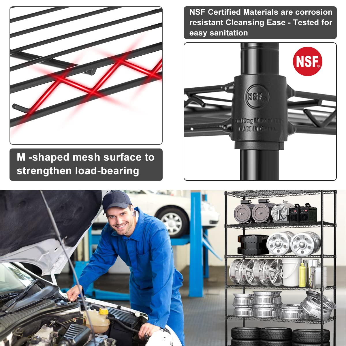 6 Tier Storage Shelves, 5999 Lbs Capacity Metal Shelf with Wheels Height Adjustable NSF Certification 48" L×18" W×72" H Heavy Duty Wire Shelving Units for Garage Pantry Kitchen Rack, Black