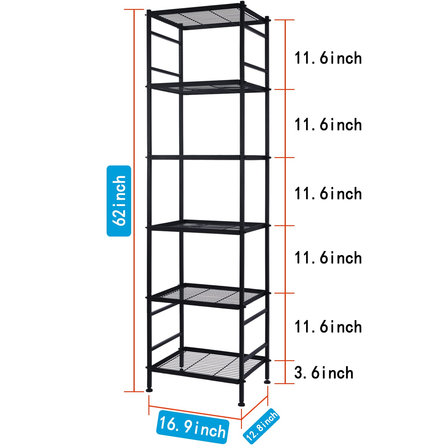- SMART STORAGE: Wire shelves perfect size(16.9”Wx12.8”Dx62”H) makes it more suitable for narrow space or room corner to store odds and ends, such as kitchen, bathroom, balcony, garage, entryway or office