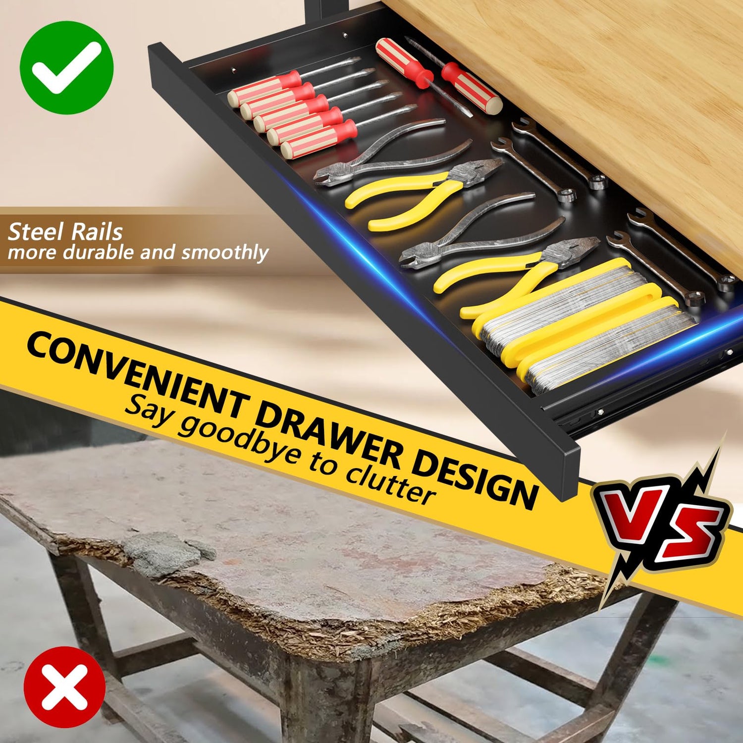 - 【Practical Drawers】 No more lost screws or misplaced hammers. Our workbench features built-in drawers, providing ample storage for all your essentials. Keeping your work area tidy and your tools within reach has never been easier.