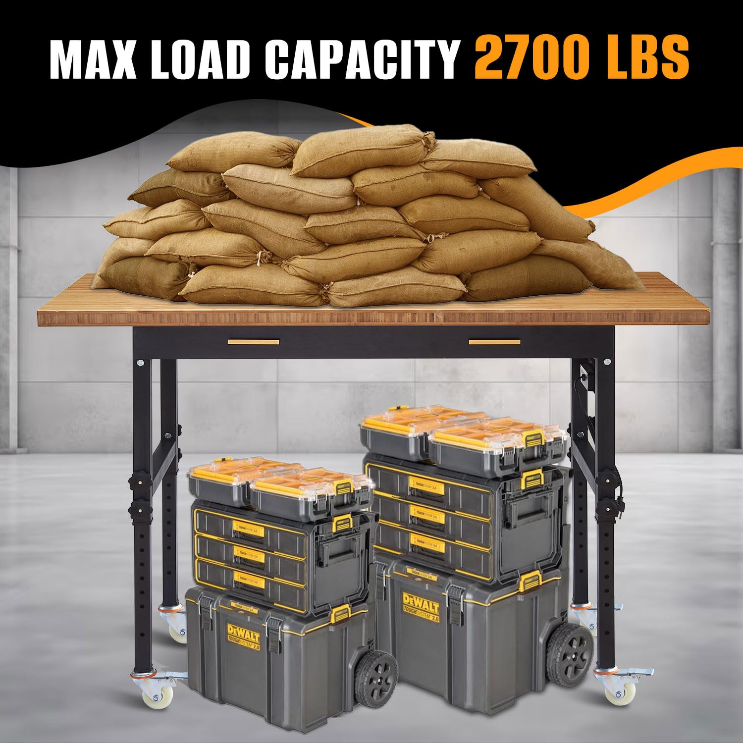 - 【Durable Bamboo Desktop】 The 1.5-inch-thick 60×24 inch(L×W) solid bamboo desktop is sourced from nature, making our workbench a great wood work table or workshop work station bench. It has a maximum weight capacity of up to 2700 pounds, making it a sturdy table for all your DIY projects.