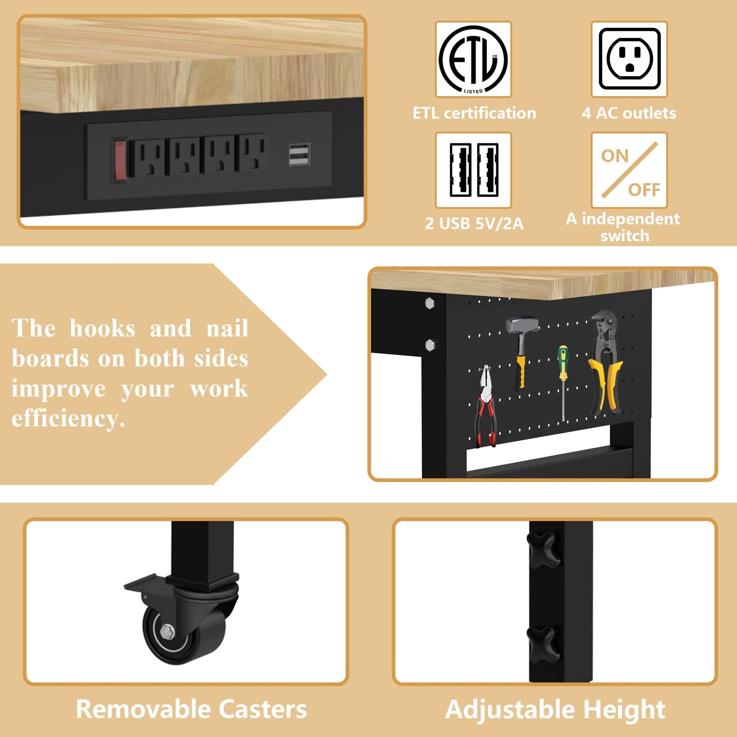 - 🛠️【ETL Certified Power Outlets】The heavy duty workbenches comes with a power outlet, including 2 USB outlets, 4 AC outlets, and a independent switch. The outlets are ETL certified for safety and durability. The workbench can power a variety of appliances such as mobile phones, desk lamps, drills and more.
