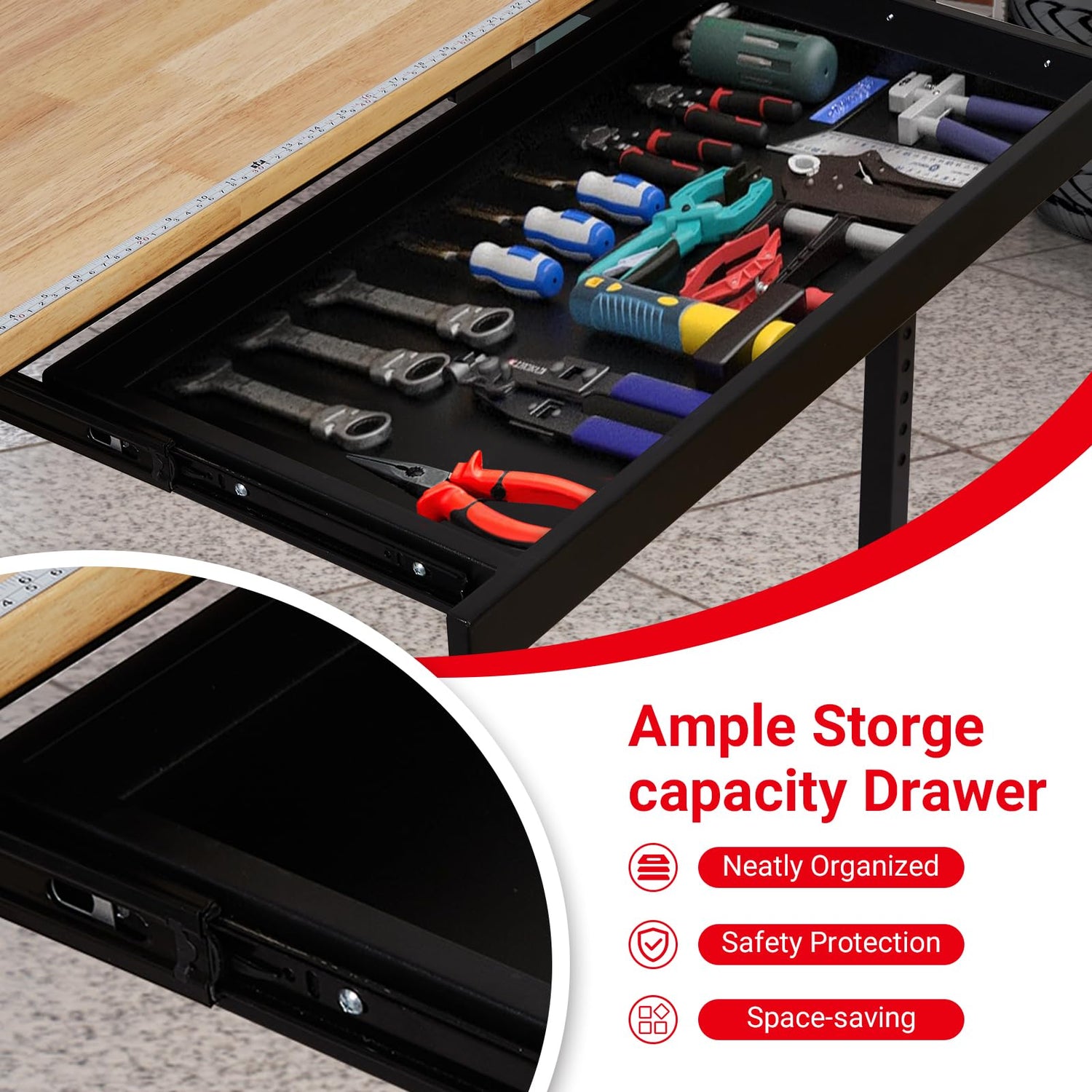 60" Adjustable Workbench with Drawer & Power Outlet,2200 Lbs Load Capacity Capacity Work Table,Heavy Duty Work Bench,Sturdy Steel Frame with Rubber Wood Table Top,for Garage,Office,Home