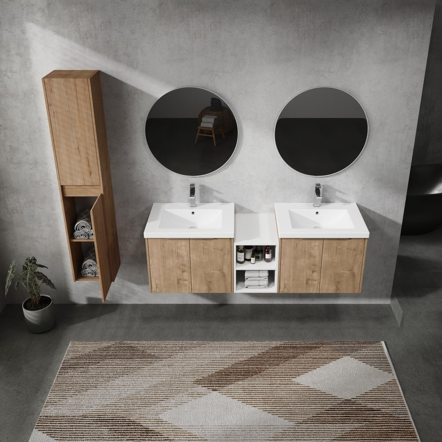 60" Floating Double Sink Bathroom Vanity Brown Wall Mount Bathroom Vanity Cabinet with Sink Combo, 60-Inch Bathroom Vanities Set with Open Storage Shelf & 2 Side Cabinet & 2 24in Bathroom Vanities
