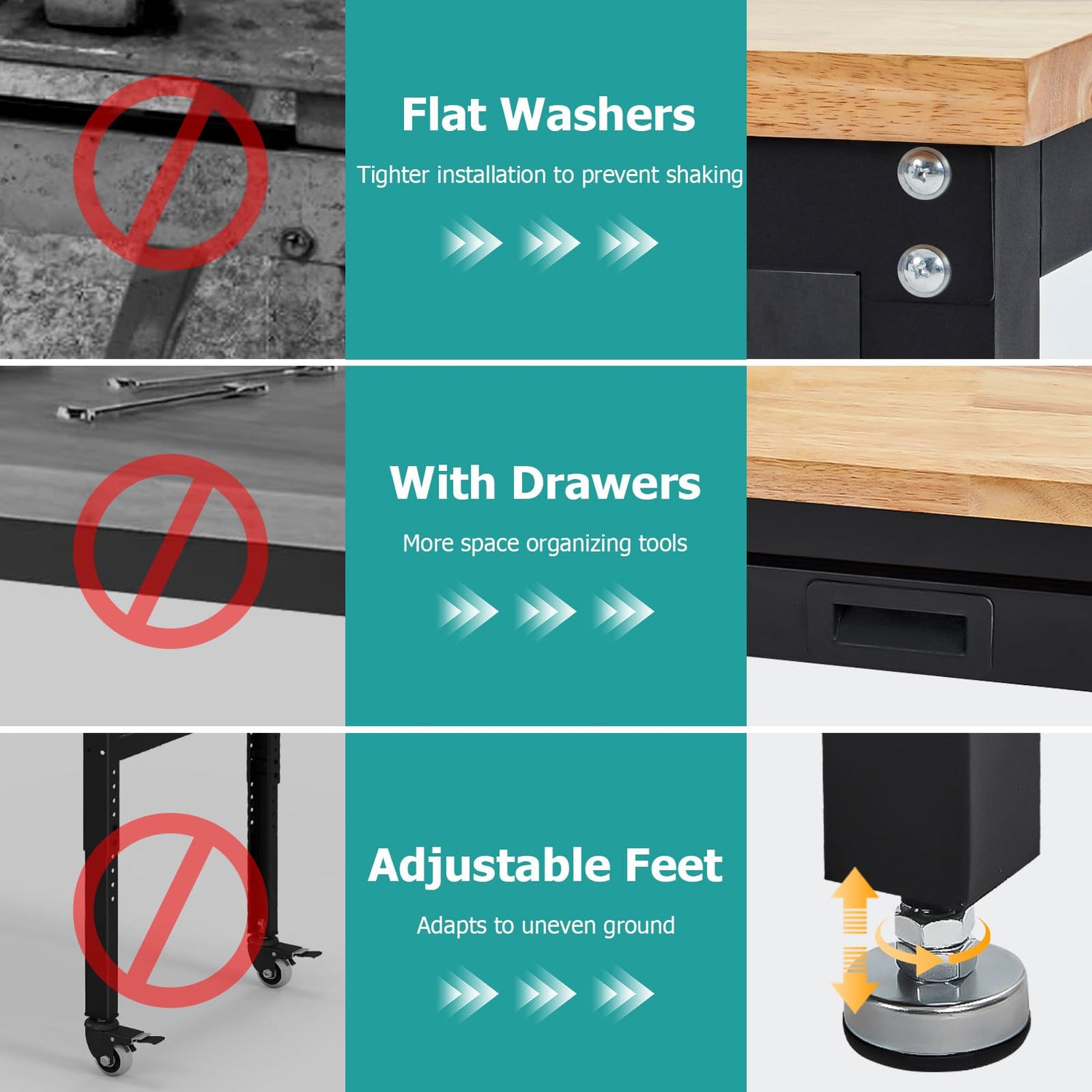 - Rubber Wood Surface: The durable 60" work surface crafted from premium rubber wood offers strength and resilience; This robust top is perfect for everything from detailed woodworking to heavy repairs, while its natural finish enhances beauty and simplifies maintenance