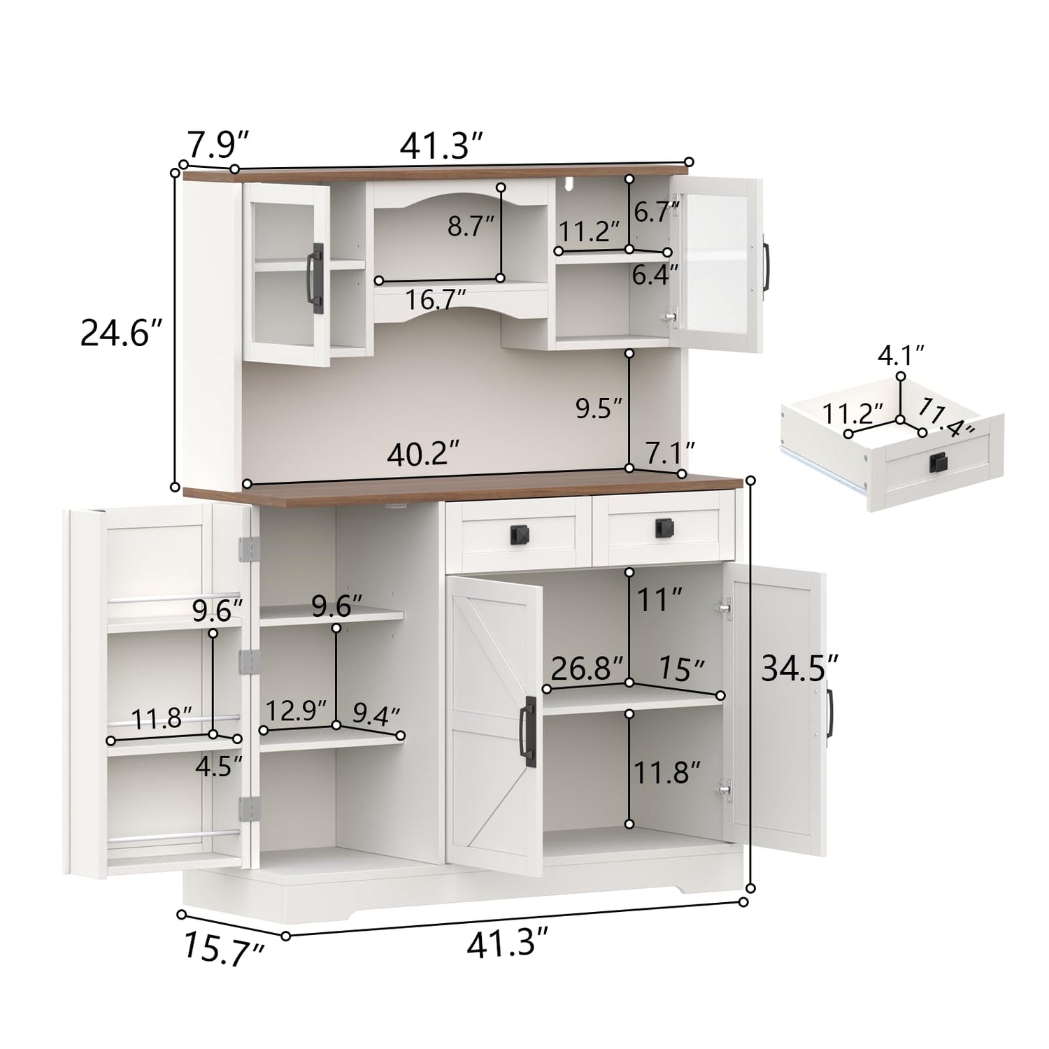 - 【High Quality Materials and Safe Design】Kitchen hutch dimensions: 15.7"D x 41.3"W x 64.17"H. It is composed of high-quality MDF, good structural design and 3.7'' thick base ensure cabinet stability. Equipped with 2 anti tilt settings, it further stabilizes the placement of the cabinet, making it safer for you and your family to use. Modern minimalist aesthetic, enhances the visual appeal of your kitchen, while seamlessly blending in with various interior décor styles.This probably isn't going to be some of your nicest furniture, but it is good value for you.