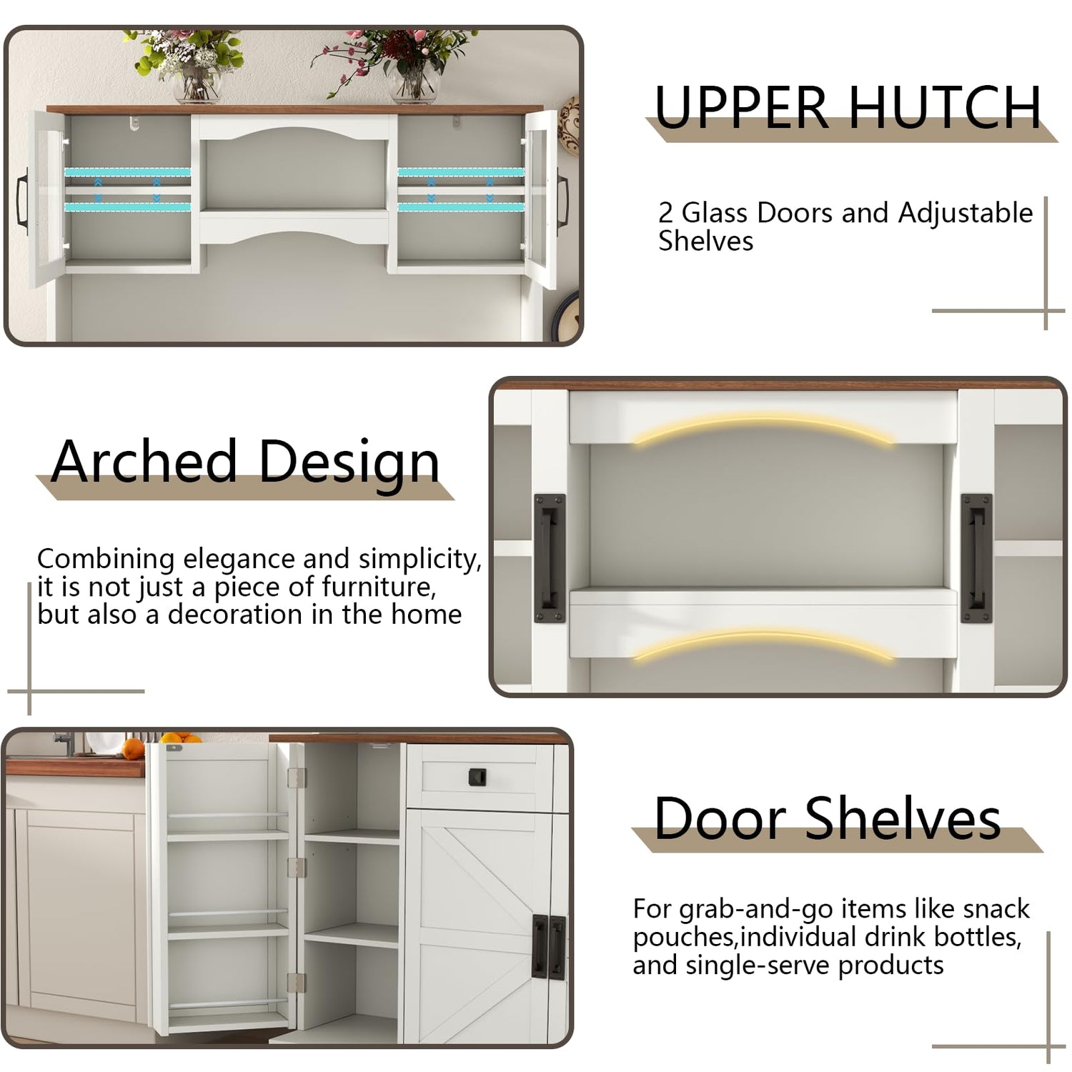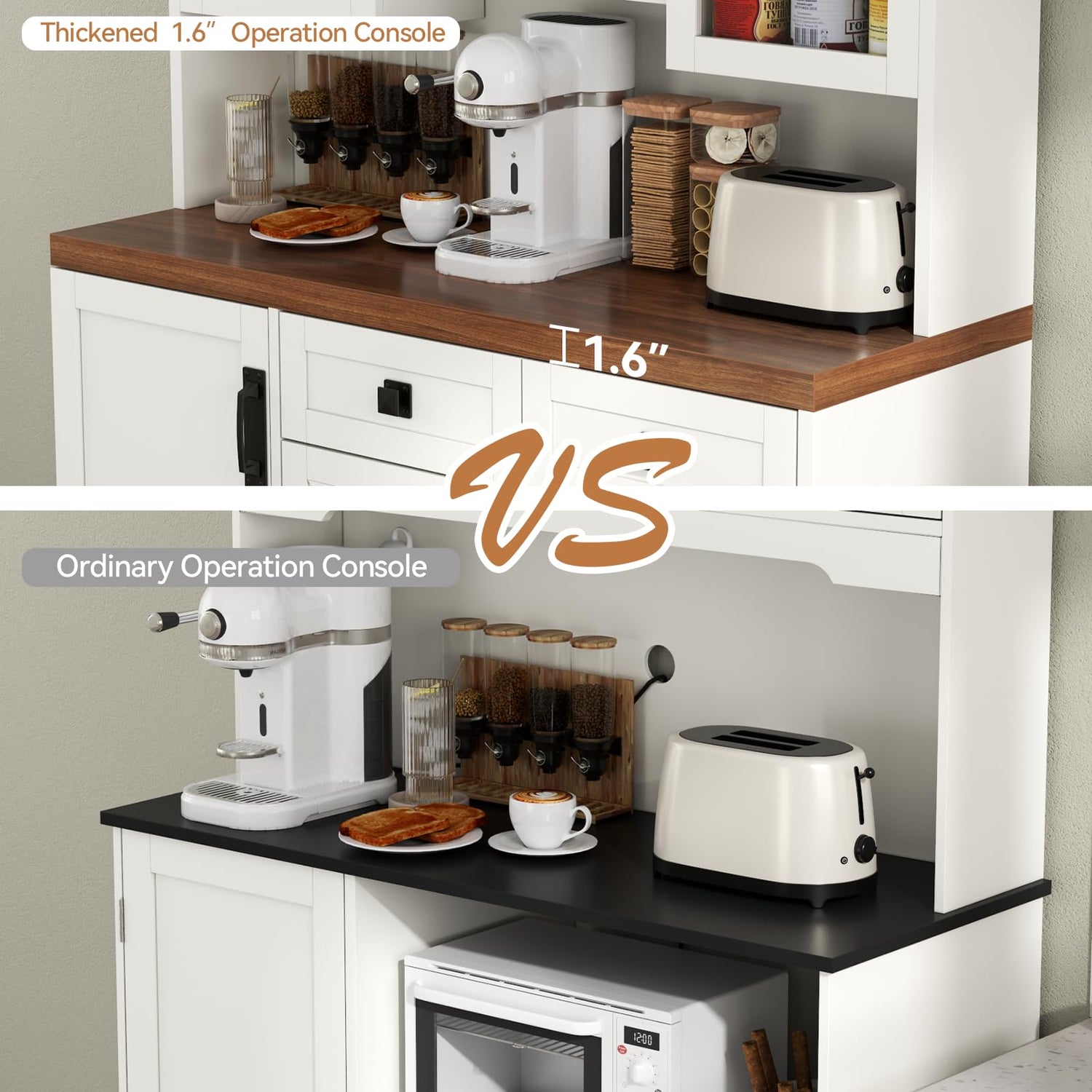- 【Farmhouse Kitchen Hutch Pantry】If you are looking for someting which was on the market searching for an affordable and Farmhouse Kitchen Pantry and matcha station. We think it was the only thing you could find that suited your needs both functionally and aesthetically!If you especially like the bottom cabinet with shelves in the door, that cabinet fits all of your baking ingredients and spices. the Rustic Style look of this cabinet is fantastic. It fits perfectly with the aesthetic of most kitchen and adds a touch of elegance without taking up too much space. The white finish is sleek and makes the room feel brighter.
