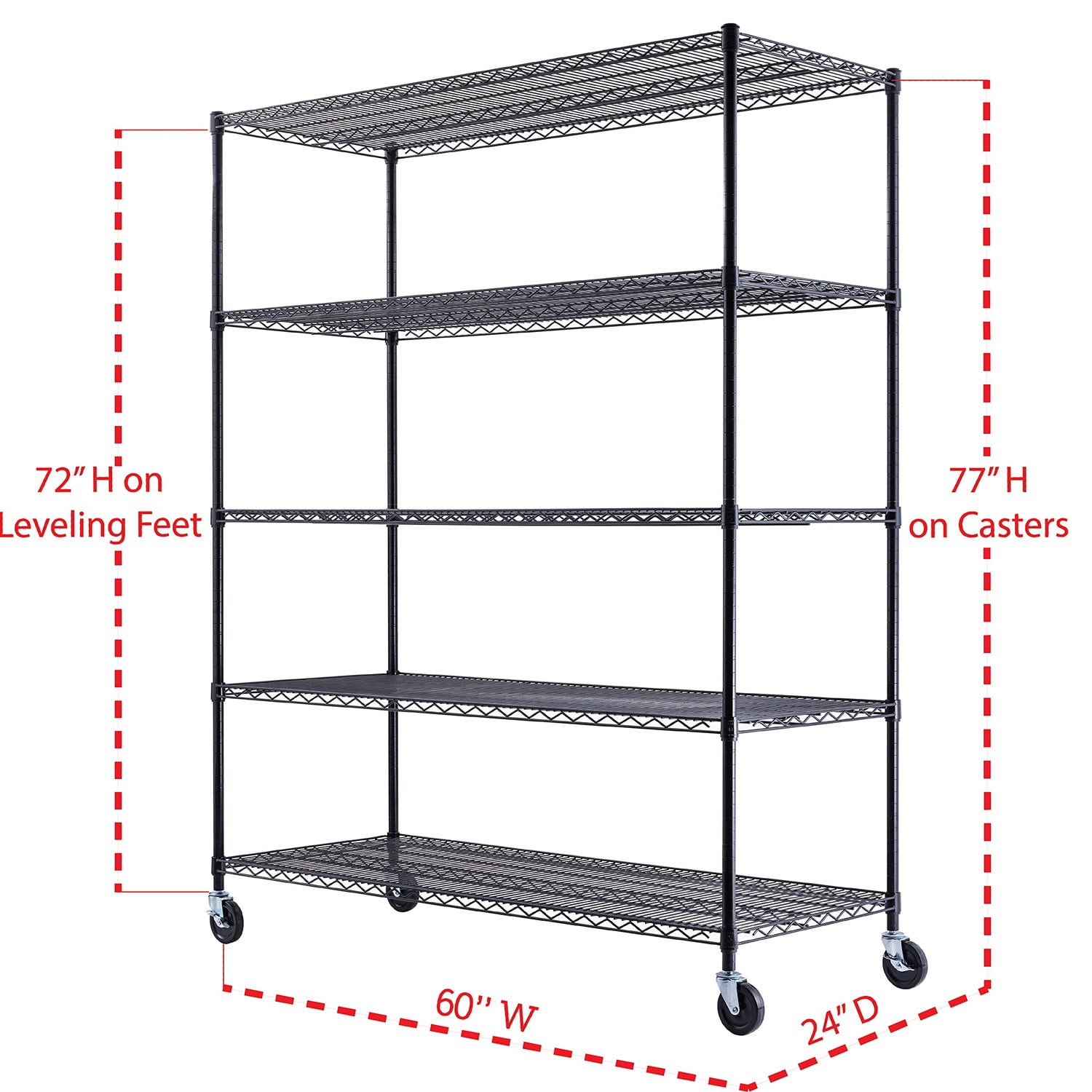 - ★SPECIFICATIONS★ ✔Color: Black. ✔Dimensions: 60"W x 24"D x 72"H (77"H on Wheels). ✔MAXIMUM Weight Capacity on LEVELING FEET: 3,000 lbs total (600 lbs per shelf). ✔MAXIMUM Weight Capacity on CASTER WHEELS: 600 lbs total (120 lbs per shelf). ✔Number of Tiers: The unit is 5-Tier and has five shelves that can be adjusted in 1-inch increments to accommodate items of various sizes.