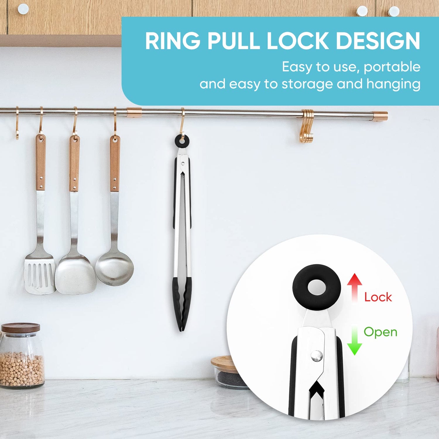 - LOCKING MECHANISM & EASY TO USE:These kitchen tongs stainless steel feature a locking mechanism which is made to last,pull the ring for lock and push for unlock,super easy operation.Hang the rubber tongs with the hanging loop after use or put in the drawer by pulling the ring to lock it,space saving.Easy to clean and safely use for dishwasher.