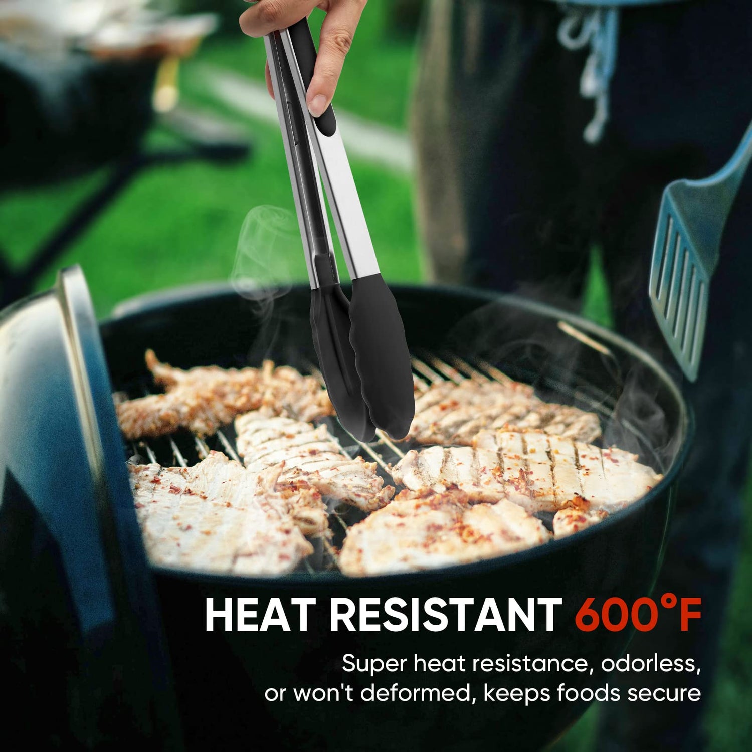 - NON STICK&HEAT RESISTANT: The serving tongs are manufactured from a premium 100% Food Grade Silicone.With soft silicone tips are ideal for nonstick cookware,which won't scratch your cookware.It has passed the safety test,100% BPA free.Able to resist up heat to 600 degrees F,the silicone won't absorb odors or flavors,nor flake into your food!