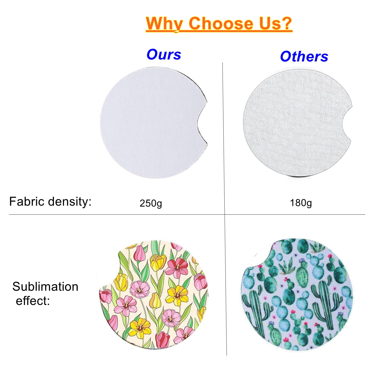 - Neoprene Material: The sublimation coaster blanks is made of diving fabric, which is soft rubber on the base with concave and convex anti-slip textures for a secure grip on any surface to prevent slipping, and 250g density polyester fabric on the front for better sublimate effect for your personalized pattern photos.