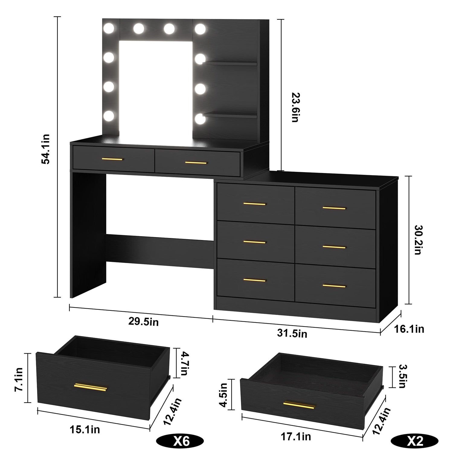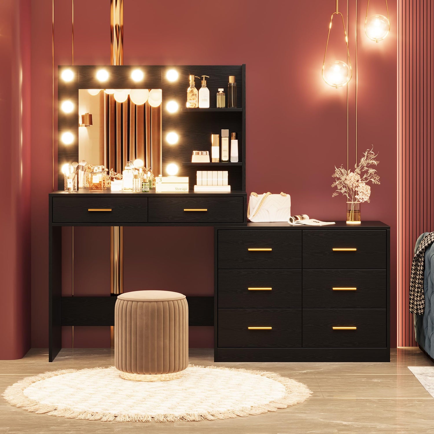 - 【Powerful Storage Capacity】Tired of rummaging through cluttered makeup bags? Our makeup vanity desk with lights is here to help you! With two open shelves and eight spacious storage drawers, you'll have ample room for all your cosmetics, skincare, and beauty tools. Picture yourself effortlessly finding your favorite lipstick or that perfect palette on a busy morning, making your routine smooth and enjoyable.