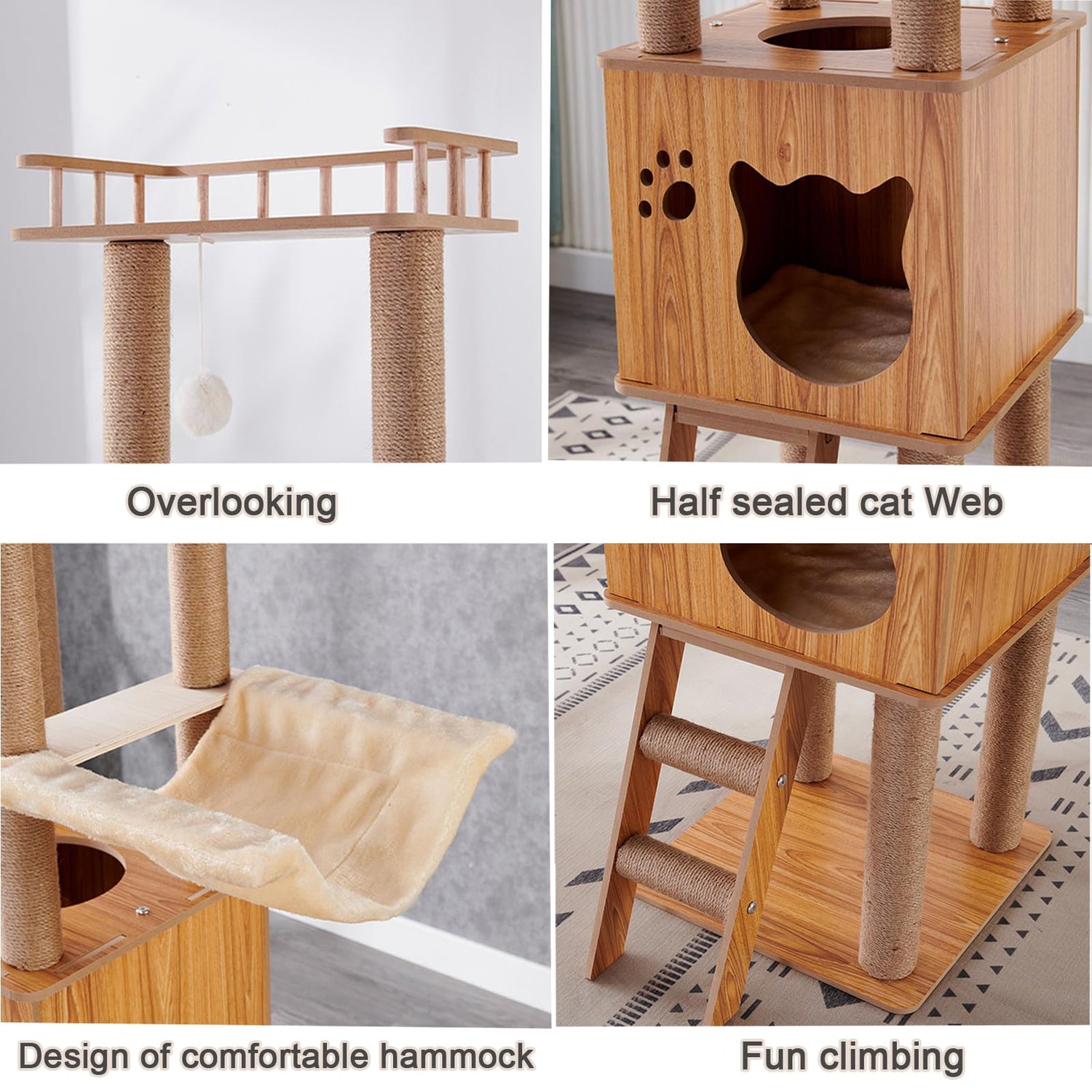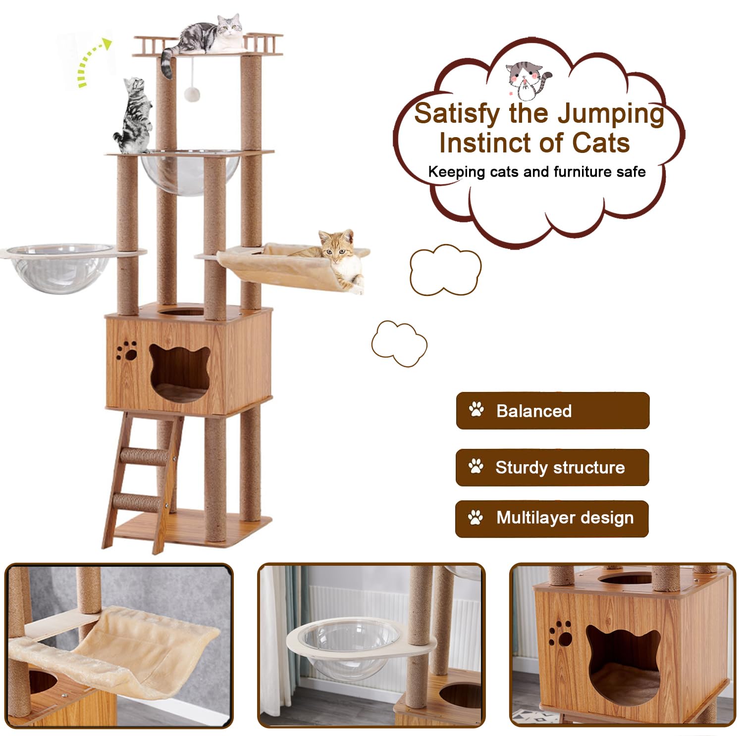 - 【Multi-functional design: solve the functions of cat grinding, climbing, jumping and resting】Wooden cat tower has stairs with sisal grinding claws, A Transparent spaceship, A cat nest,A cat hammock, An observation deck and There is a Dangling Ball, and there are a total of 6 floors of platform space, allowing 3 to 6 cats to move and play at the same time, which is convenient for cats and allows owners to interact at any time.