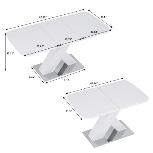 This extendable dining table for 4 6 set boasts a modern and stylish design,enhancing its overall aesthetic appeal. The table features a sturdy base with a striking staggered X-shaped design, enhancing its geometric beauty. Its robust construction enhances the table's strength, enabling it to withstand daily use and maintain reliability over time. Designed to support weights of up to 220 pounds, making it perfect for various occasions, from casual snacks to festive family feasts. OVERALL DIMENSIONS: 62.99"(L) x 31.5"(W) x 30.12"(H);