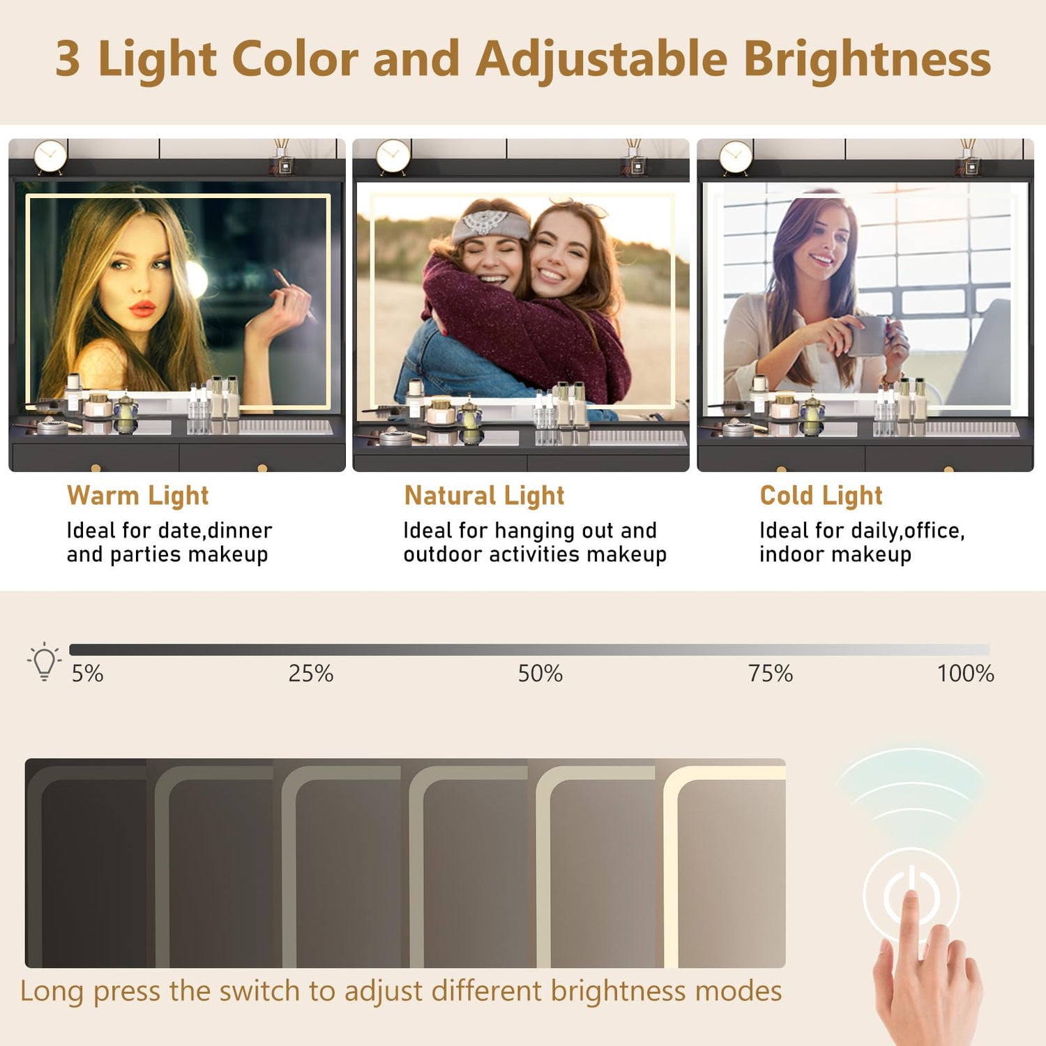 - Vanity Desk with 60,000-color LED RGB Cabinets: Our led vanity come with 2 RGB clear tempered glass cabinets which has 60,000 color led lights and multiple lighting modes, like timing function, music sync, mic sync,tec. for choose, you can control it via APP or RF switch. Provide you a stunning visual and immersive experience while you relax or entertain.