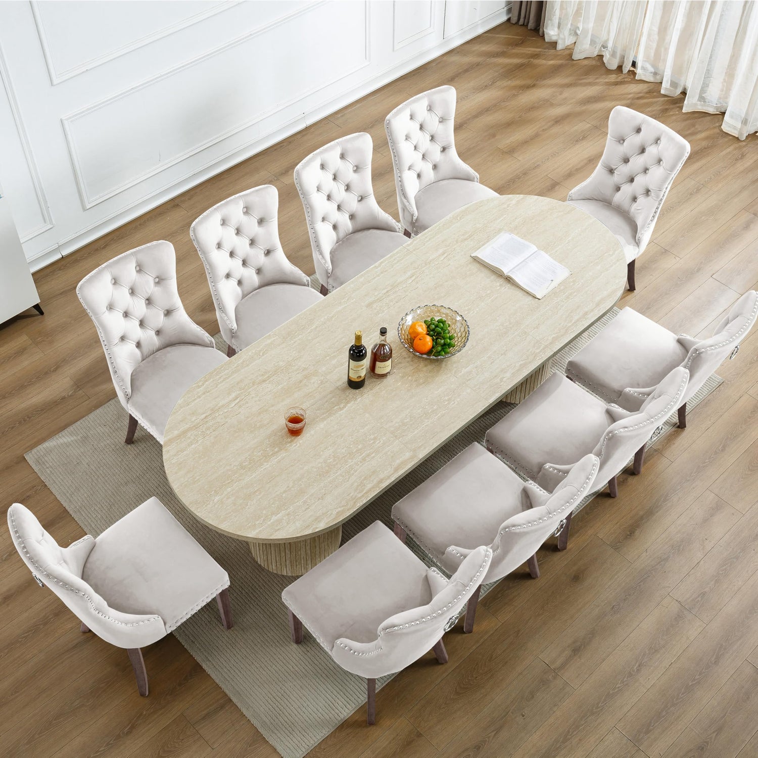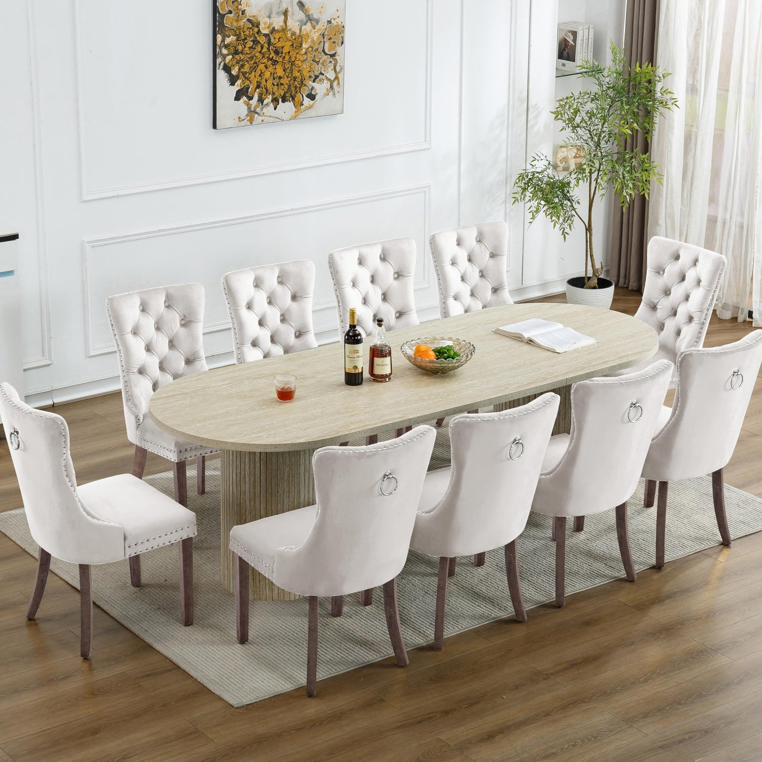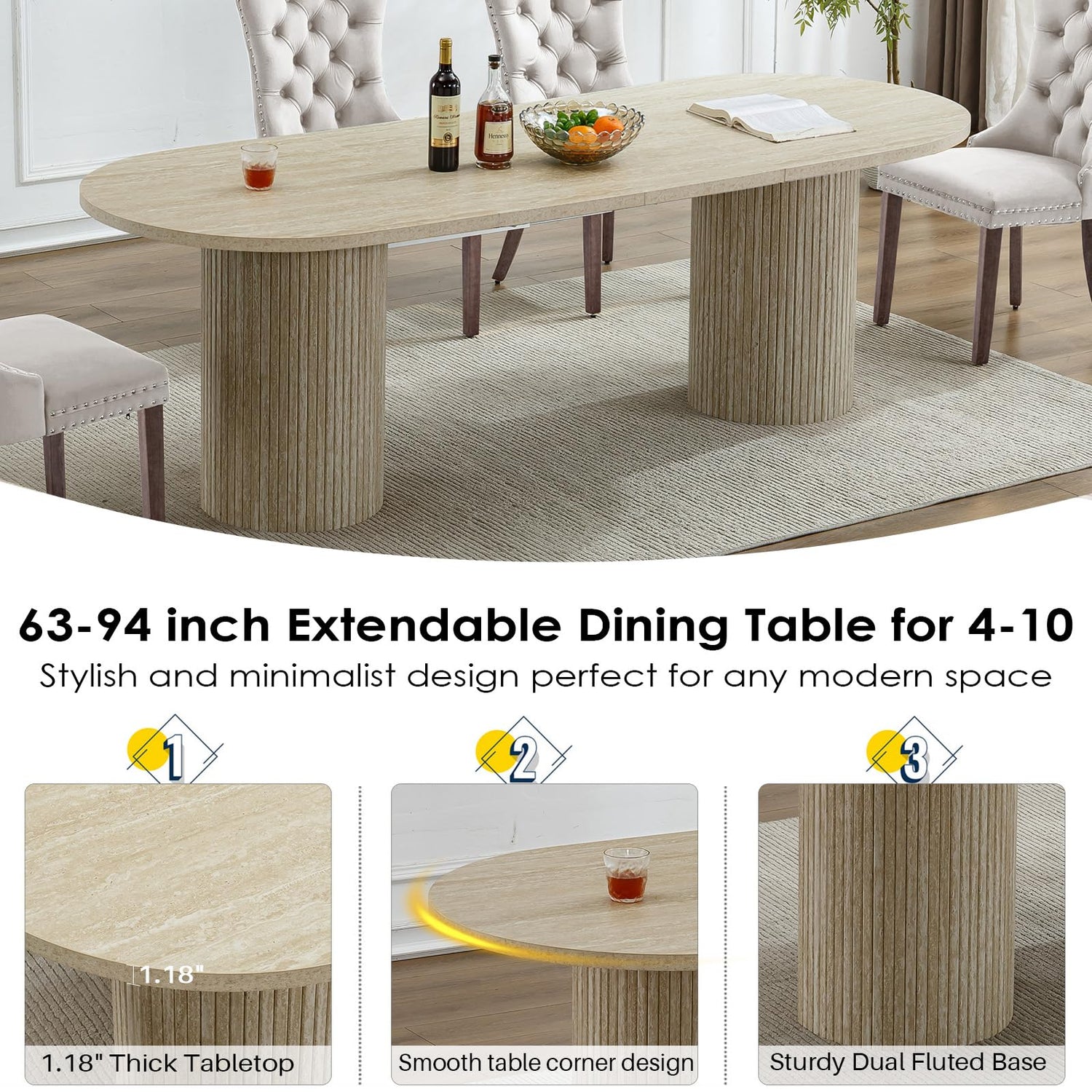 63"-94" Extendable Dining Table Set with 10 Beige Upholstered Chairs, 11 Piece Modern Oval Kitchen Table Set for 10 People, Space-Saving Expandable Dining Room Table Set with Wood Fluted Base