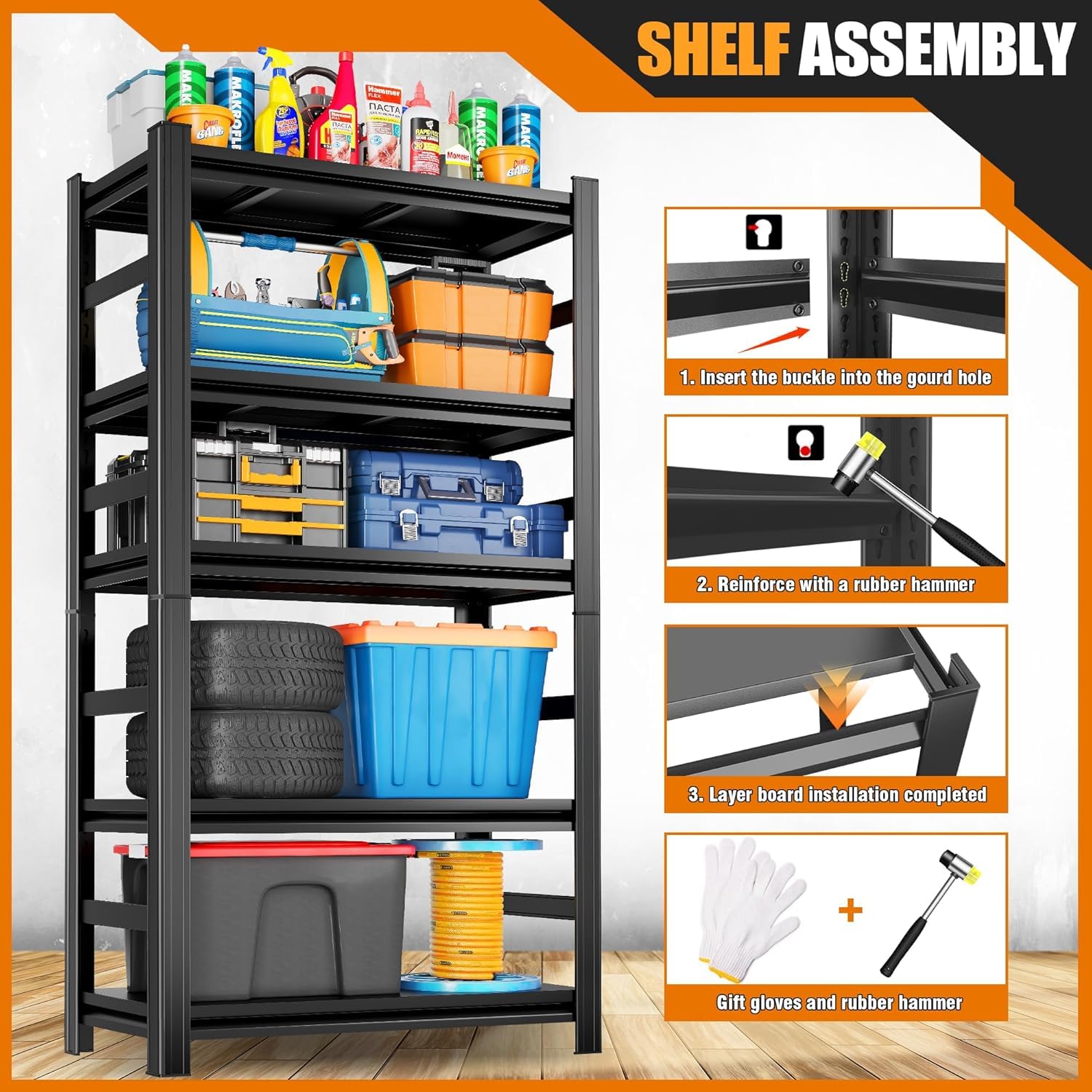 Details: This metal garage shelving unit is made of sturdy cold-rolled steel, this Robust garage shelving system boasts a massive 1500LBS total load capacity—The double column design enables the metal shelves to carry up to 300LBS per level. Assemble it effortlessly in just 10 minutes with zero tools thanks to its intuitive interlocking design; no bolts, nuts, or experience needed. Customize freely: every detachable shelf adjusts to your item heights, making it perfect for garage organization. Its versatile 63"H x32"W x 16"D frame is perfect for storing tires, heavy-duty toolboxes, oil drums, and auto parts., adapting seamlessly to garages, warehouses, kitchens, retail spaces, and beyond. Protected by odorless high-quality spray coating, The easy-to-clean surface is very fine and smooth, giving the shelves a service life of decades. Backed by 24/7 professional support, triple-inspected manufacturing, and corner-protected shipping, your investment includes a 1-year warranty and 30-day free returns. We prioritize your experience and deliver optimized storage solutions for every need.