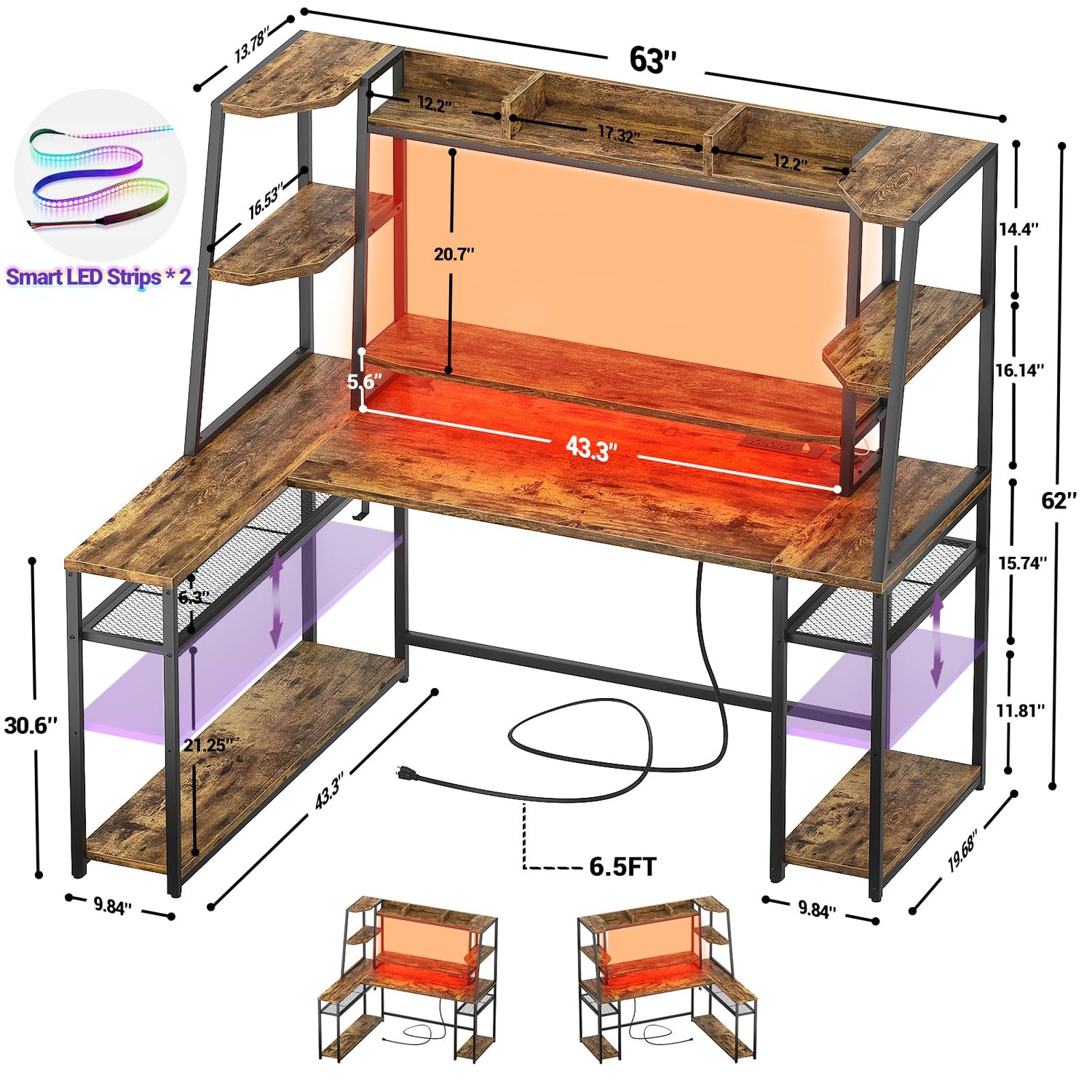 63'' Large L Shaped Gaming Desk with LED Lights & Power Strips, Reversible Gaming Table Desk with Hutch, L-shaped PC Gaming Desk with Storage, L Gamer Desk with Monitor Stand & Hook, Rustic Brown