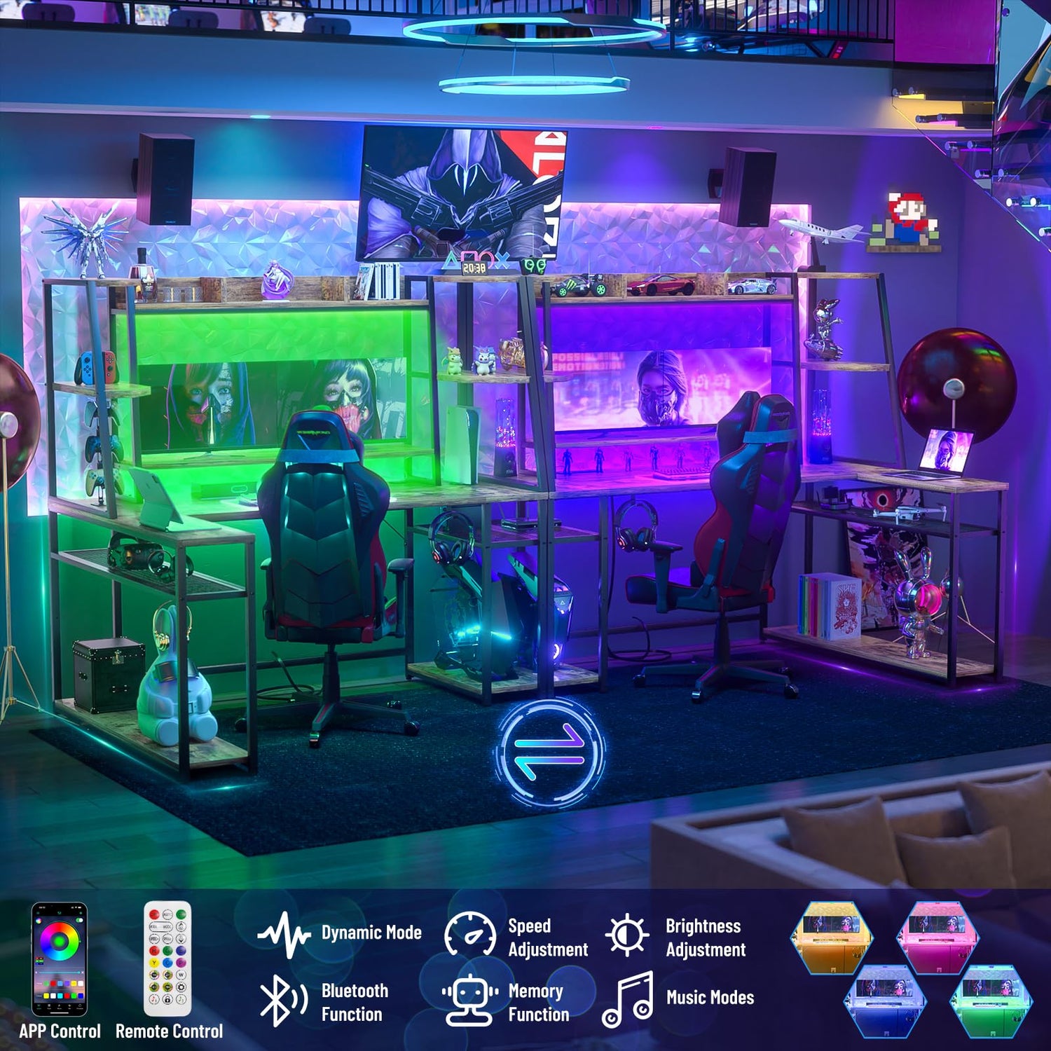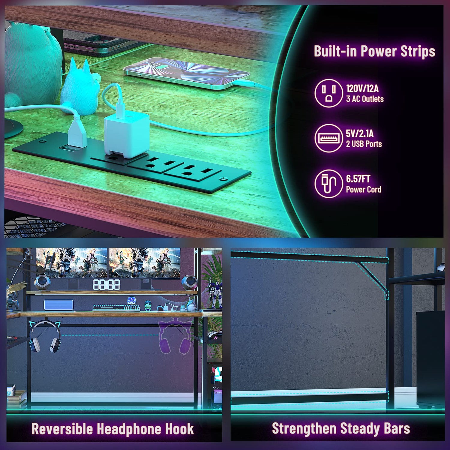 - L-Shape Gaming Desk with Power Outlet - With extra power outlets and USB connectors built into the desktop, this computer desk will make your setup even more convenient. It's handy and could help to charge your multiple gaming systems. Good to place your monitors, speakers, mic, mouse & keyboard.