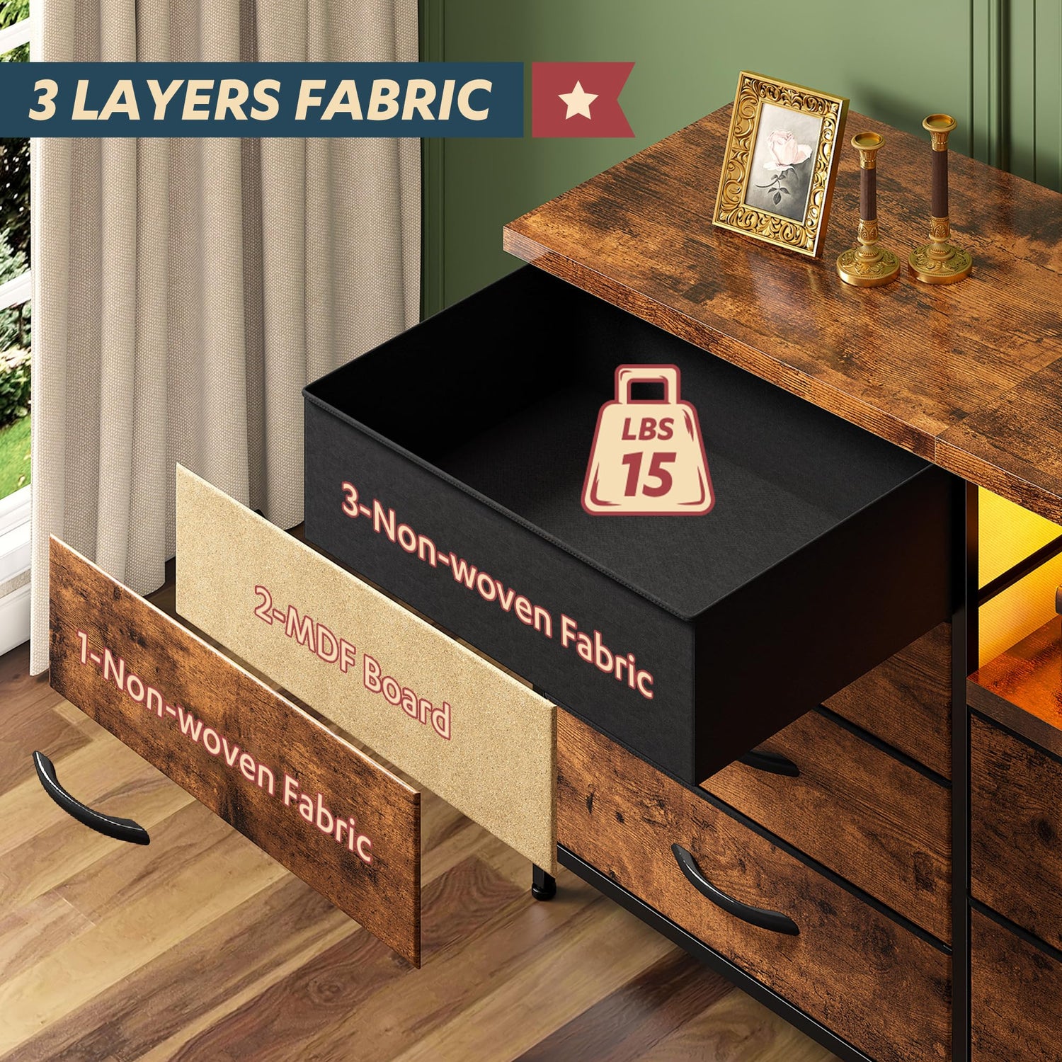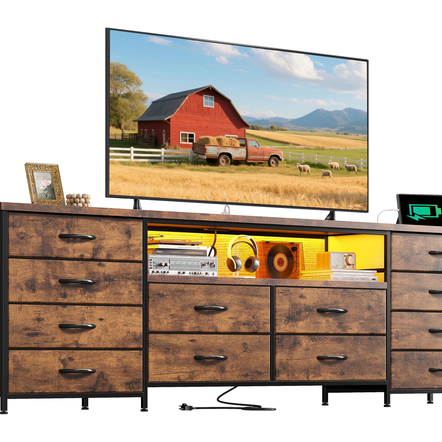 63" Long Dresser for Bedroom with 12 Fabric Drawers Entertainment Center with LED Lights & Power Outlets TV Stand for 70 Inch TV, Organizer for Bedroom, Rustic Brown