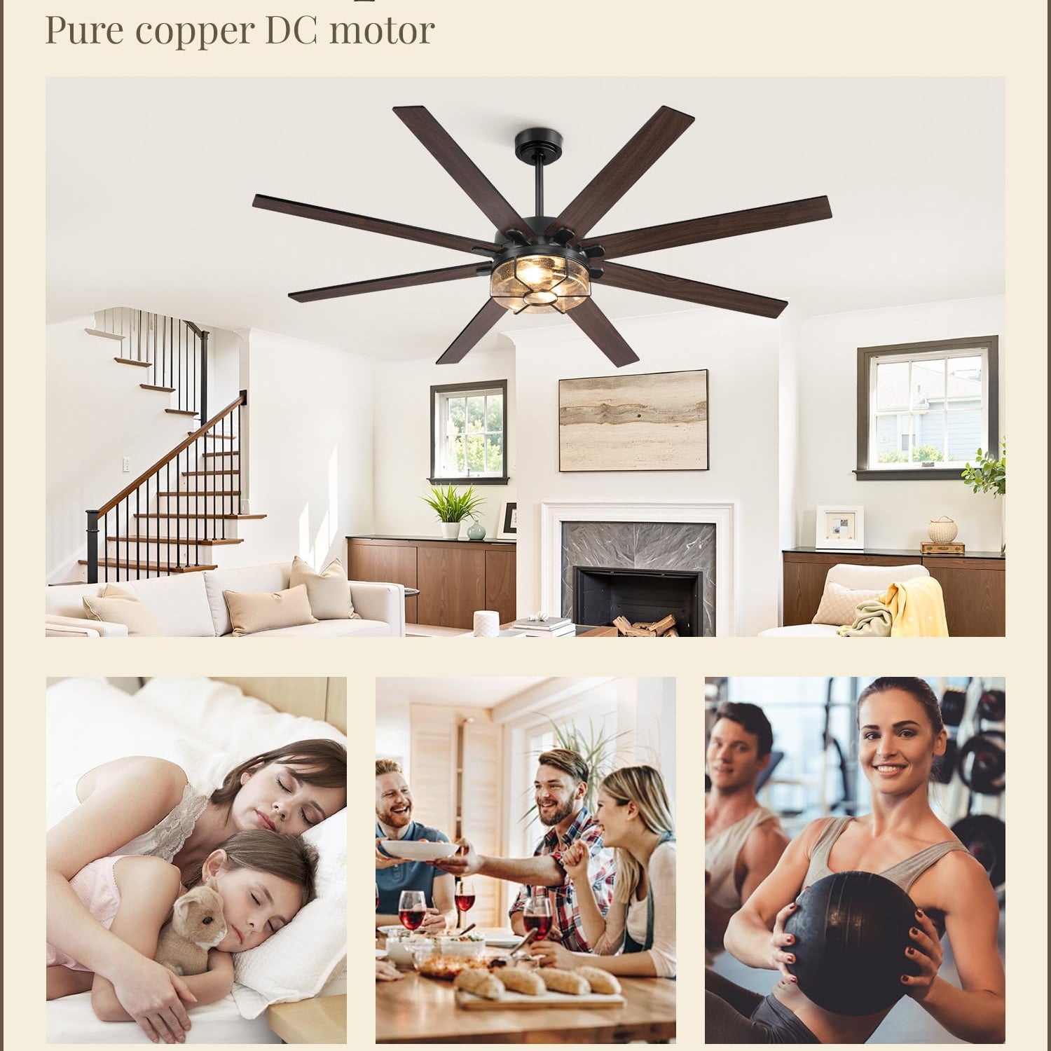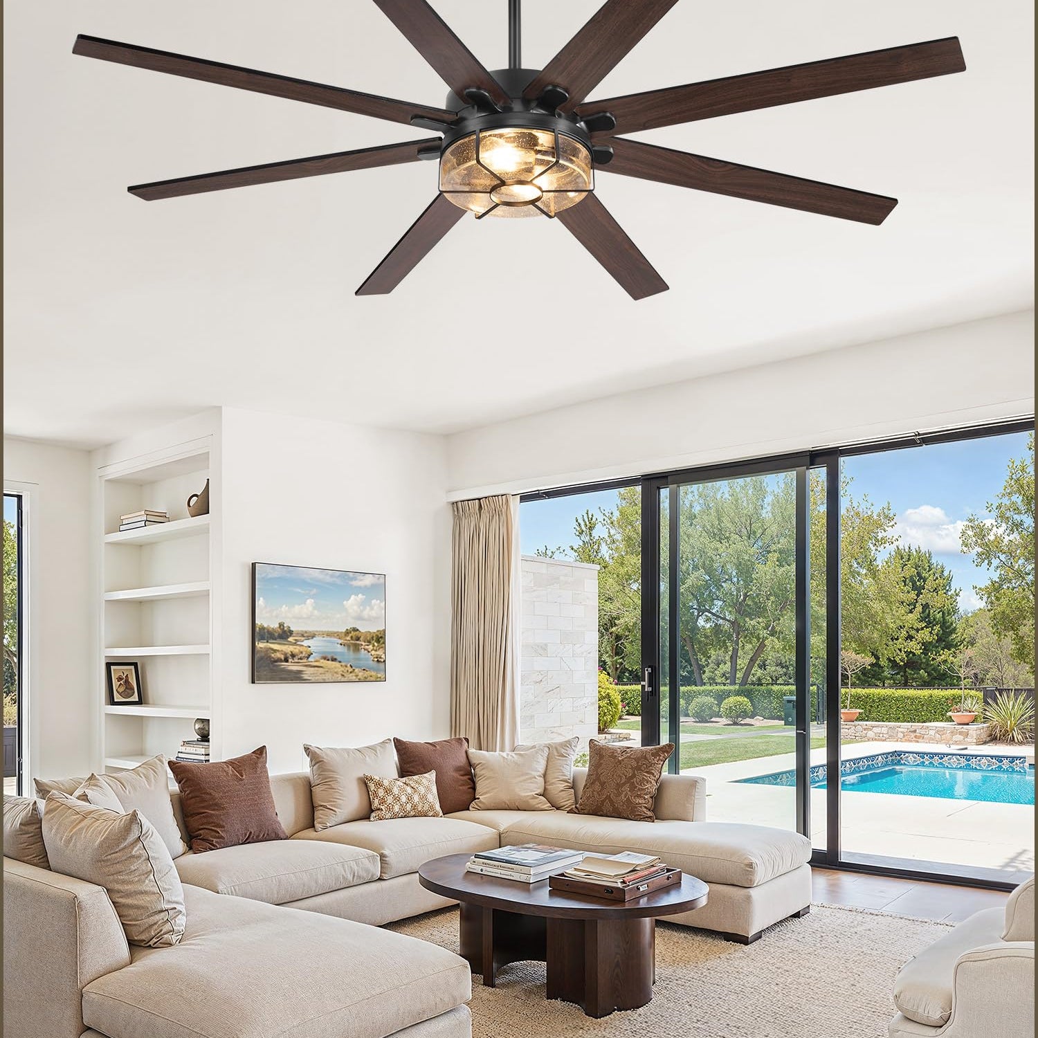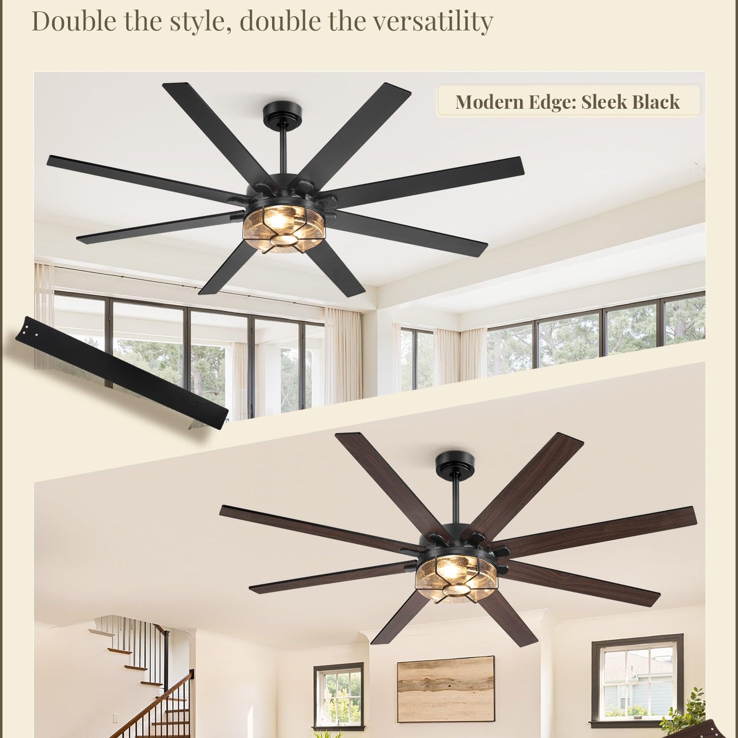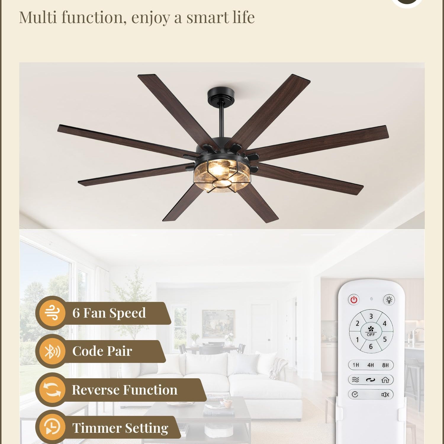 - Exquisite Seeded Glass Ceiling Fan:This fan features a seeded glass shade with a chandelier design—its hand-bubbled design softens the light, transforming harsh light into a warm ambiance, making it both practical and strikingly decorative. It also features reversible blades that switch between walnut (for a rustic look) and light oak (for a modern look) without tools. Its seamless farmhouse-meets-contemporary style blends beautifully with modern styling, perfect for kitchens, bedrooms, and dining rooms.
