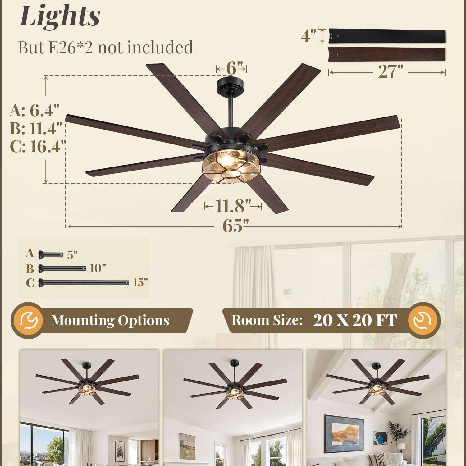 65 Inch Farmhouse Ceiling Fan with Lights & Remote Control, Quiet Reversible DC Motor, Wooden Blades, Seeded Glass Lampshade - Ideal for Bedroom, Living Room, Dining Room