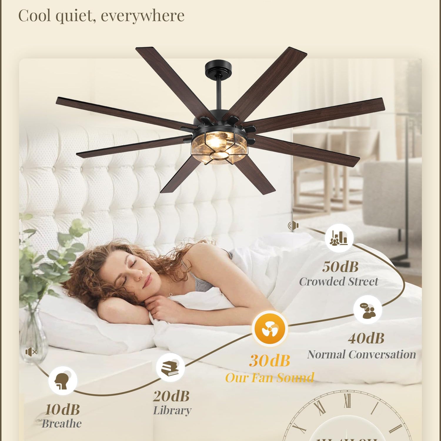 - 6 Speeds Adjustable: The large ceiling fan with 6 speeds to choose from, easily switch from a gentle breeze to a powerful airflow. Boasting strong performance, it operates at less than 35 decibels, ensuring a quiet sleep. Equipped with a 1/4/8-hour timer, you can preset the light to turn off without getting up, which is convenient and practical.