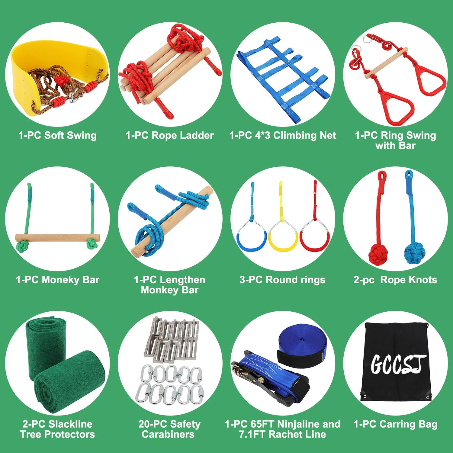 - 【More Accessories】: Our obstacle course has 12 sets of accessories, including 7 different types of obstacles, including Wooden ladder, soft board swing, climbing net, triangle pull ring, gymnastic ring, monkey bar, monkey ball, these ninja obstacles will bring a new experience to children.
