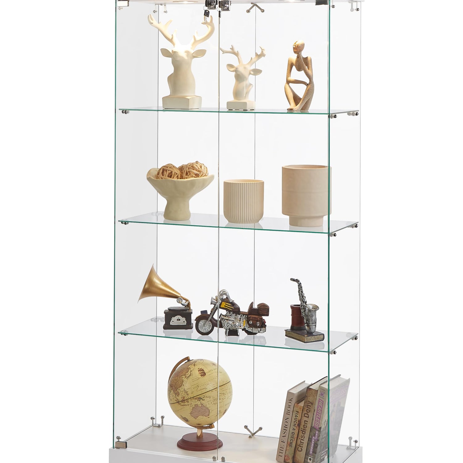 - 👍️【Large Capacity Glass Showcase】The glass display cabinet is made of 5mm thick tempered glass and high quality medium fiberboard. Each glass shelf level can withstand a maximum weight of 50 pounds, bottom can support up to 100 lbs, great for displaying books, photos, medals, action figures, wine bottles, toys, artwork, decorations.