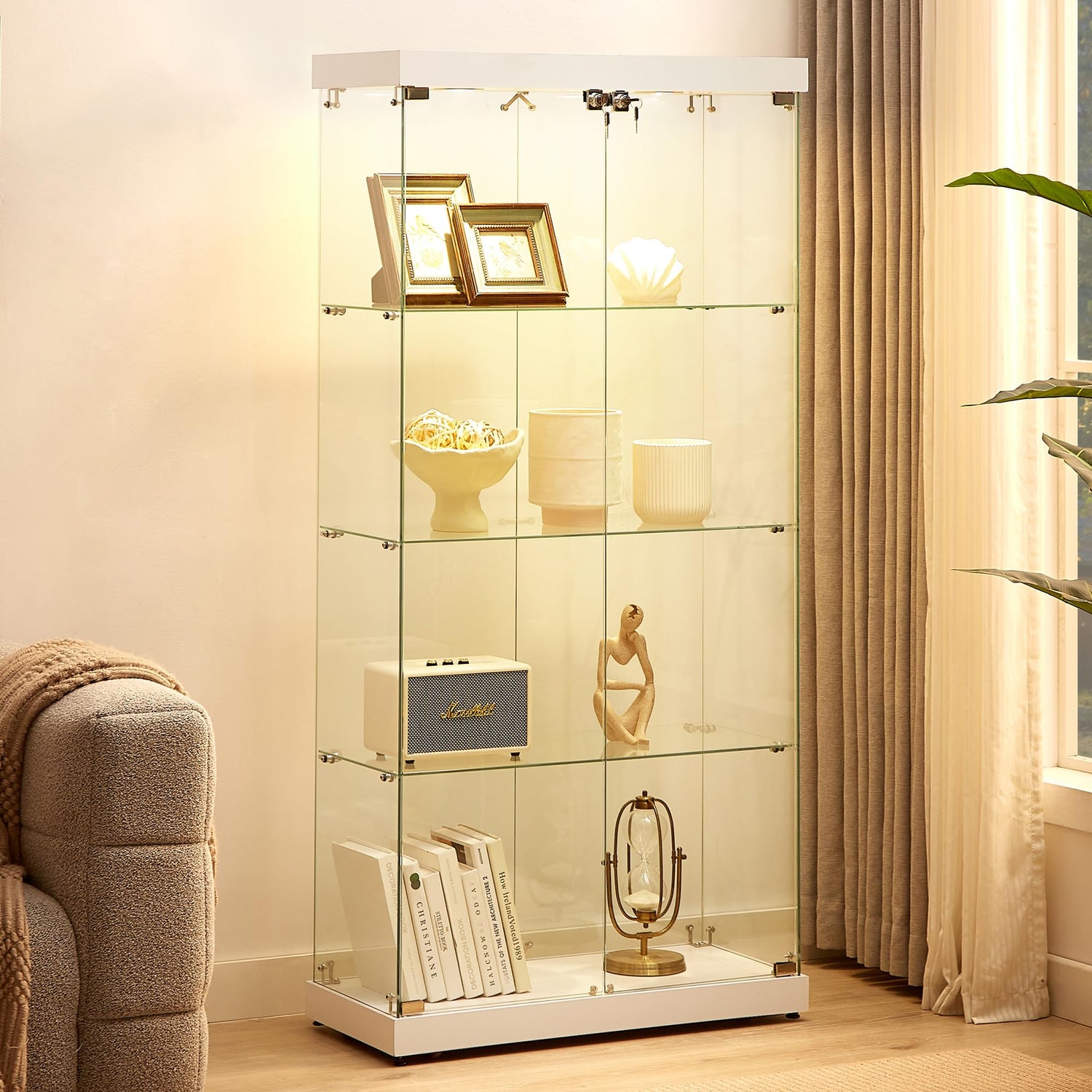66.3'' 4-Shelf Glass Display Cabinet with 2 Doors & LED Lights,Glass Curio Cabinet Display Case, 5mm Tempered Glass Storage Cabinet, Floor Standing Bookshelf for Living Room Bedroom Office White