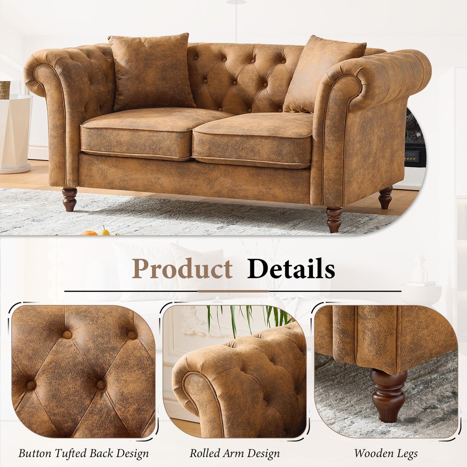 66" Chesterfield Tech Fabric Loveseat Sofa, High-Tech Fabric Upholstered Rolled Arm Couch, Tufted Mid Century Modern 2-Seater Sofa for Living Room, Office, Small Apartment,Brown