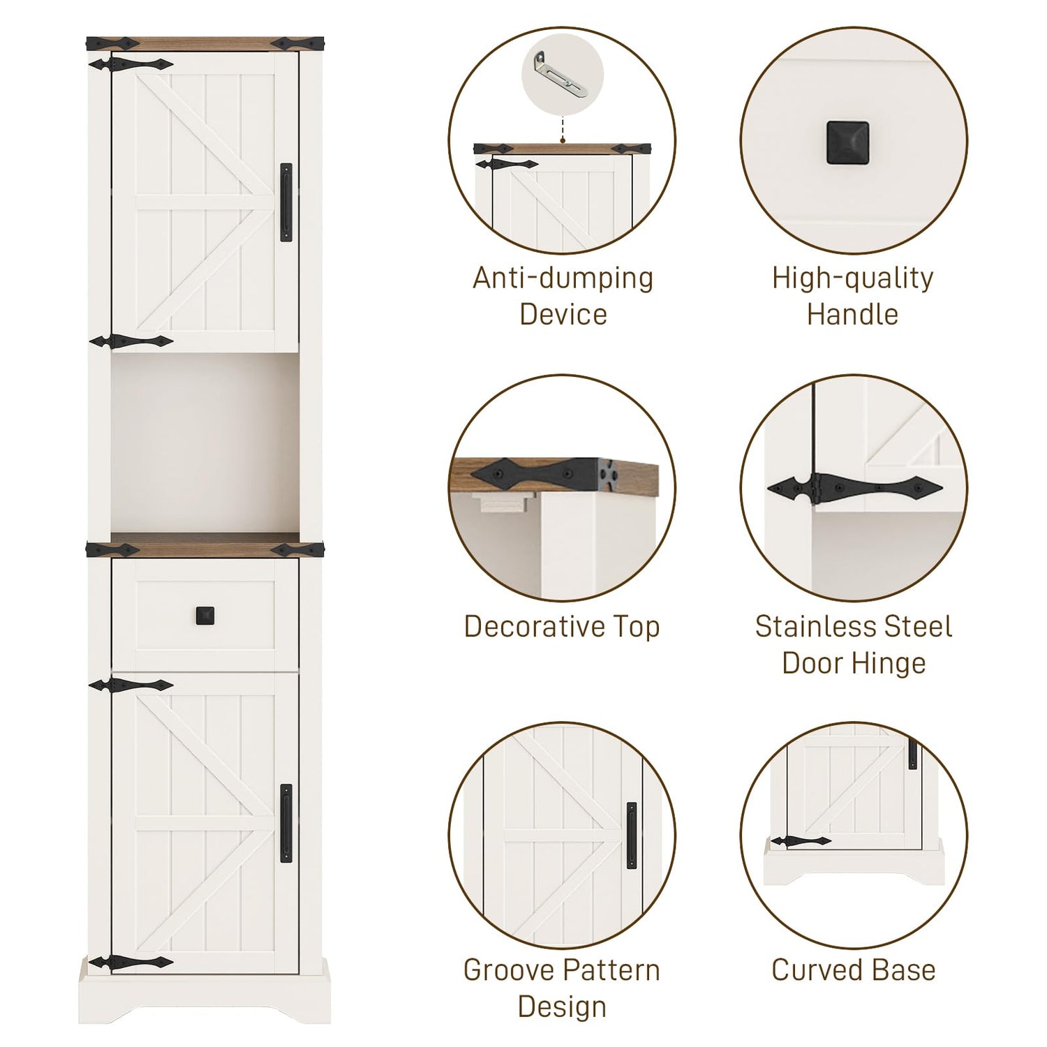 - đăSTURDY AND SAFEă:Our farmhouse tall cabinets storage is made of premium engineered wood material, utilizing a combination of good craftsmanship and structural design to provide great stability and display strong load-bearing capacity. The back anti-tipping device serves as a second-layer reinforcement structure to attach the wall, which is very stable and prevents wobble or tipping over.