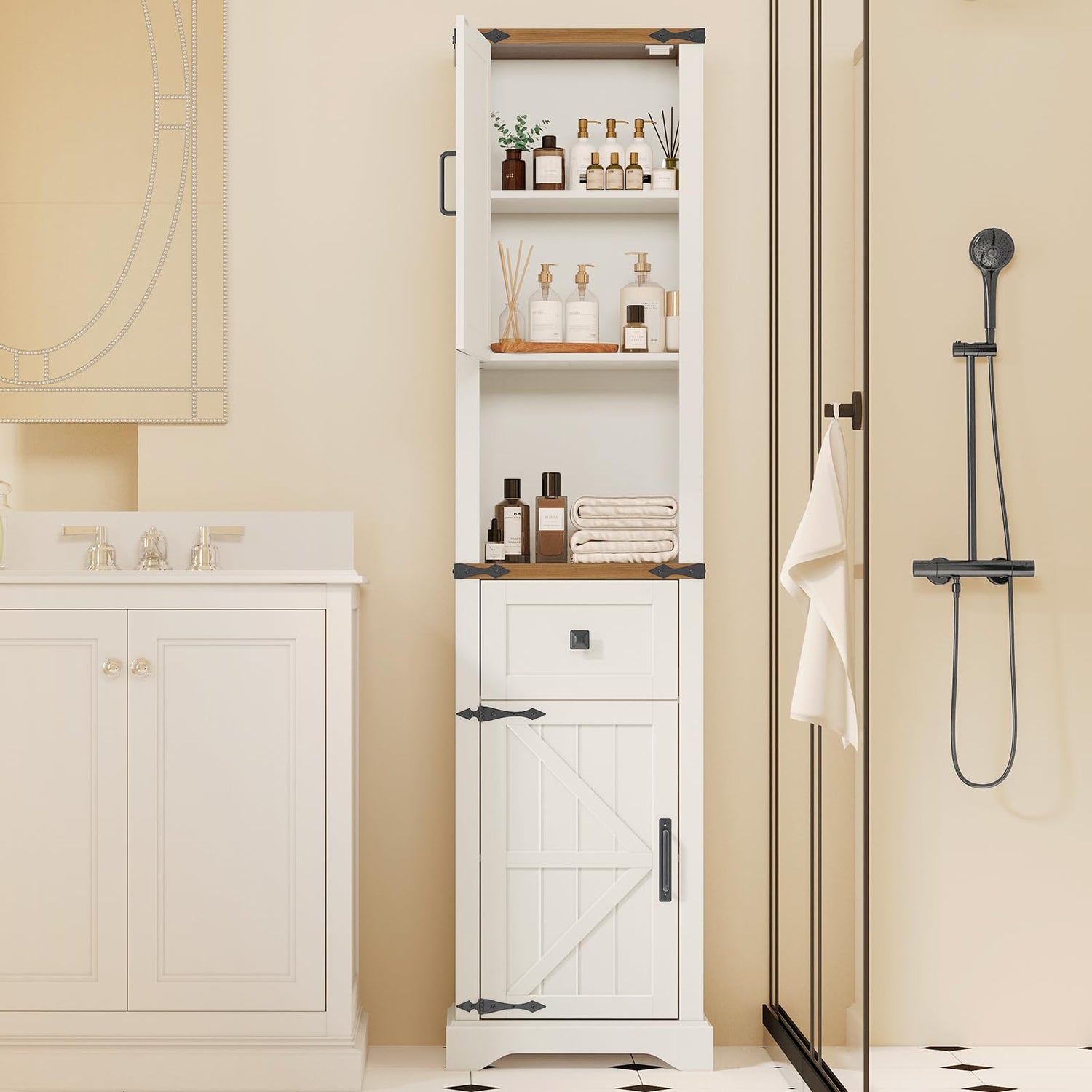 - đăFARMHOUSE STORAGE CABINETă: This 65.79" Tall farmhouse cabinet with storage features a unique wood grain finish with metal trim. Rustic barn door style gives a great blend of charming rustic, adding a beautiful, charming touch to your living room, kitchen and bathroom. 65.79" white cabinets for storage with doors can fit well in any space in your home and match with different styles of scenes.