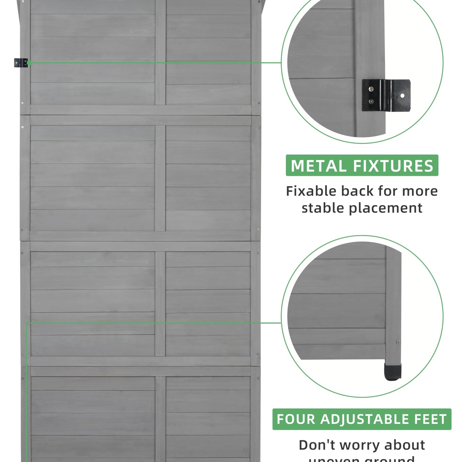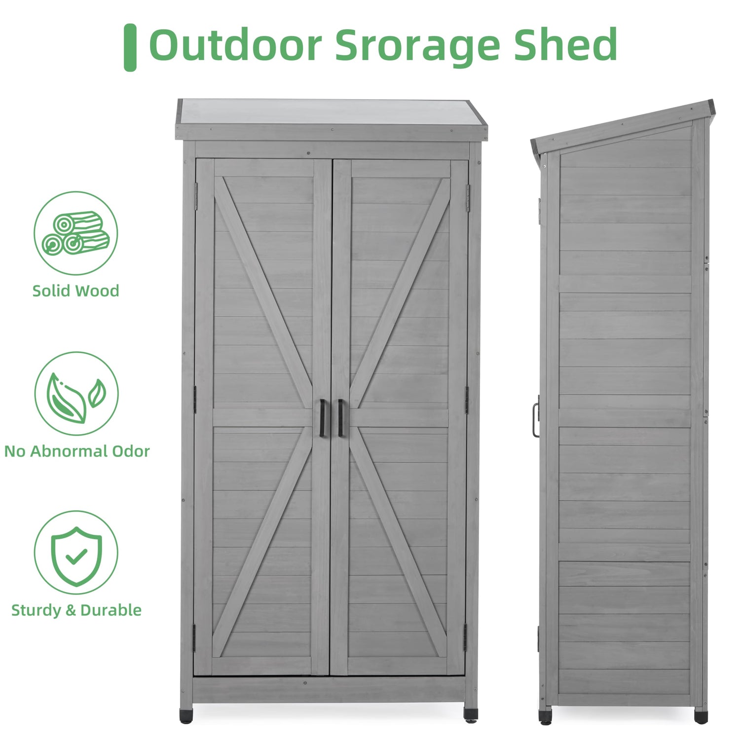 - Patented Farmhouse Design: Vertical Tool Shed made of premium cedar wood with water-based gray coating to protect the garden storage shed from bad weather, rain, sunlight, and water accumulation. featuring a patented farmhouse design for classic style.
