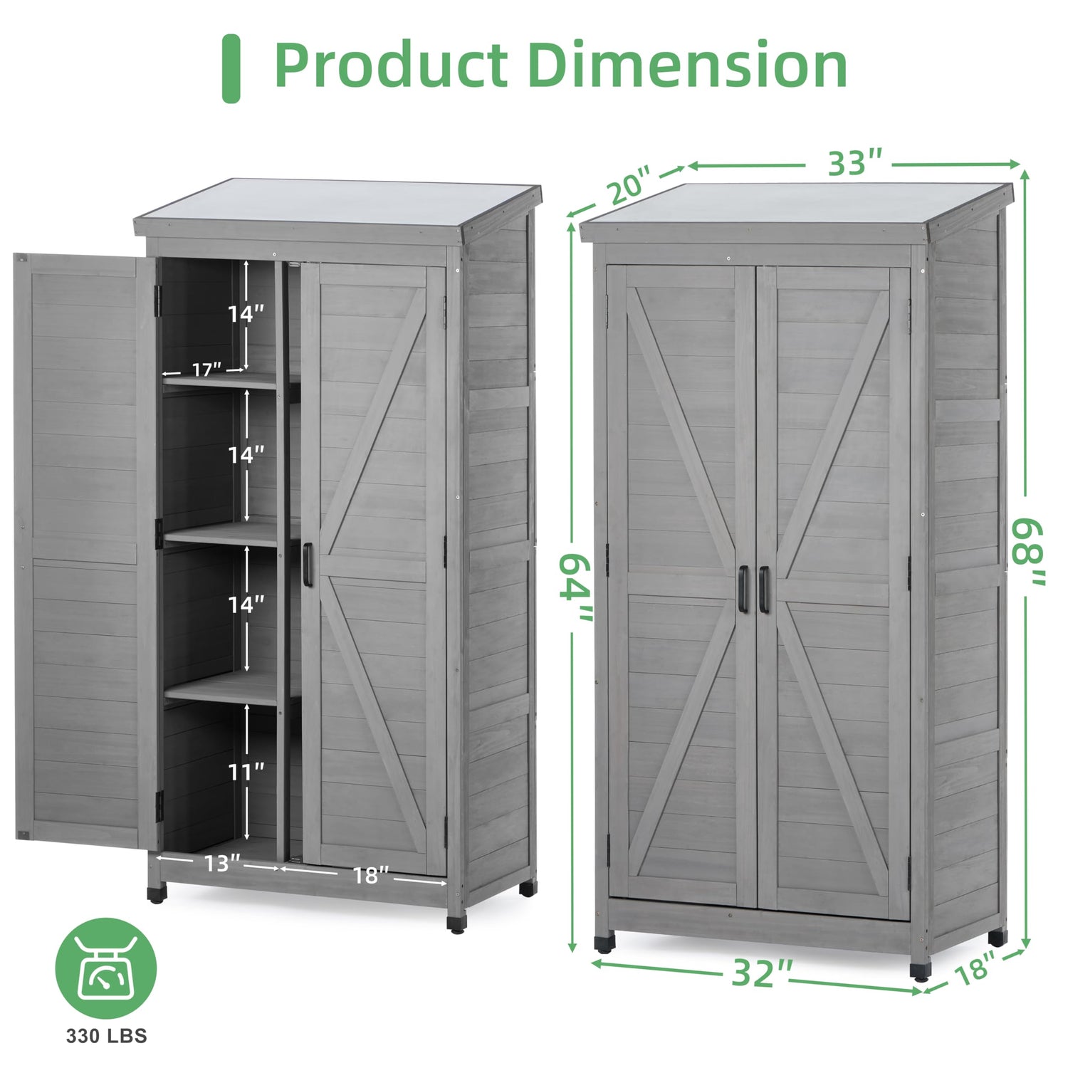 - Large Storage Shed: Spacious outdoor shed, 33"L x20"W x 68"H for the garden and yard to store your big or small, long or short, regularly shaped or irregularly shaped tools. The Metal top with sloping design, allows rain to flow down quickly.