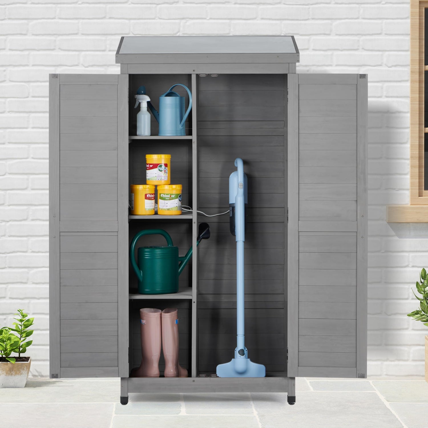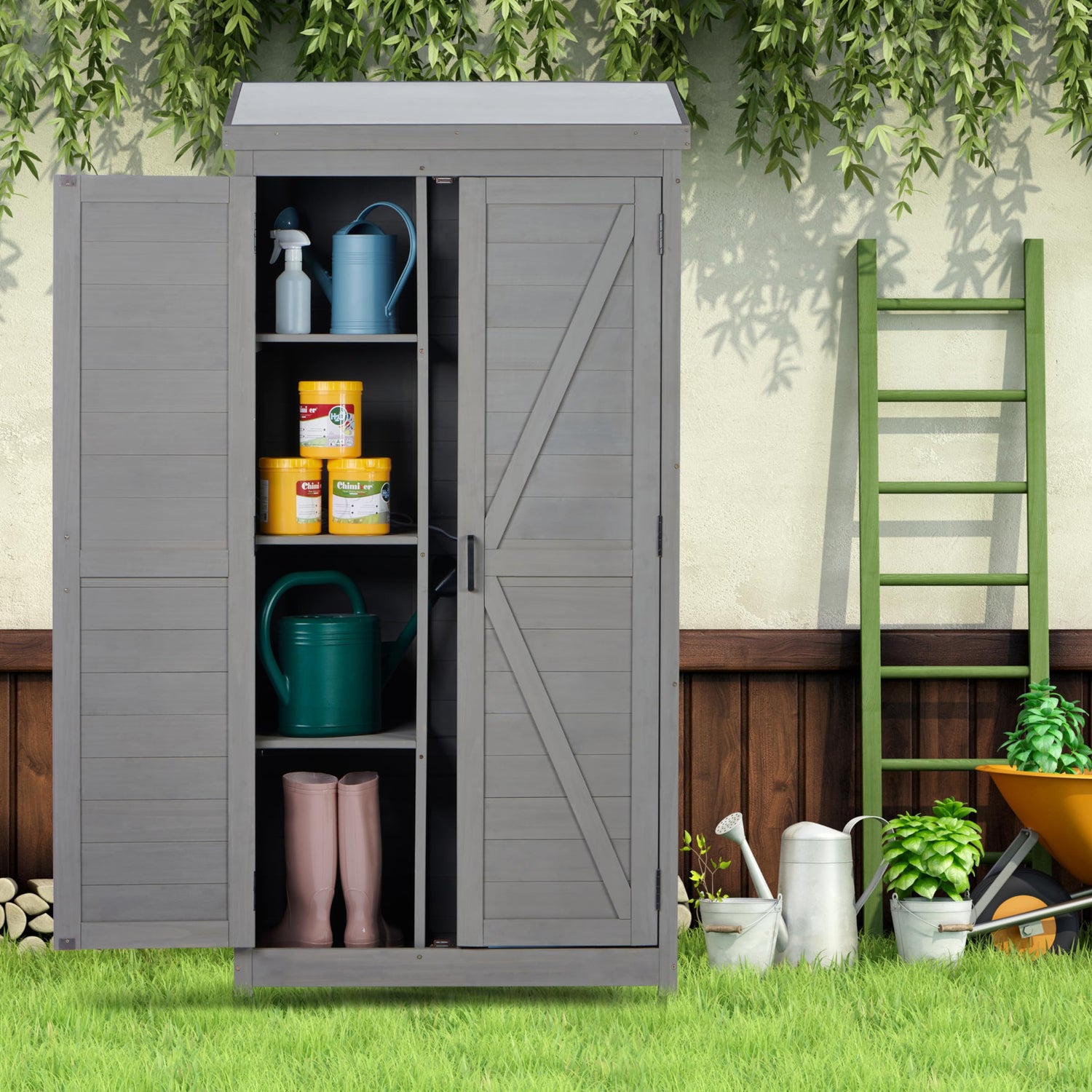 - Multifunctional Storage Cabinet: Wood storage cabinet serves various purposes: utility tool closet shed, garden shed, pool supplies vertical storage, or patio storage for lawn and gardening tools, sports equipment. Suitable for garden, patio, porch, garage, etc.