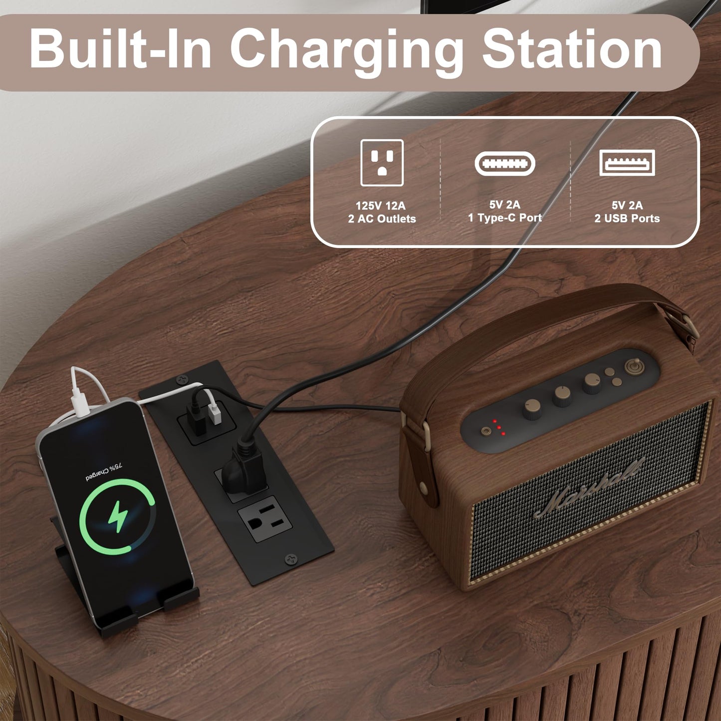 69" Mid Century Modern TV Stand with Charging Station, Farmhouse Curved Round Edge TV and Media Console Table with Drawer and Shelf, Fluted Entertainment Center for Living Room, Bedroom, Walnut