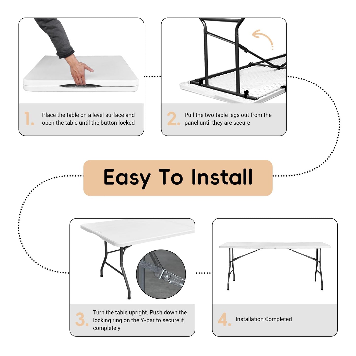 - EASY TO STORE:The folding banquet table totally weigh about 26 pounds, and an adult can complete the installation independently. The foldable design of the table allows you to fold it up when not in use, making it easy to carry or store in a compact space