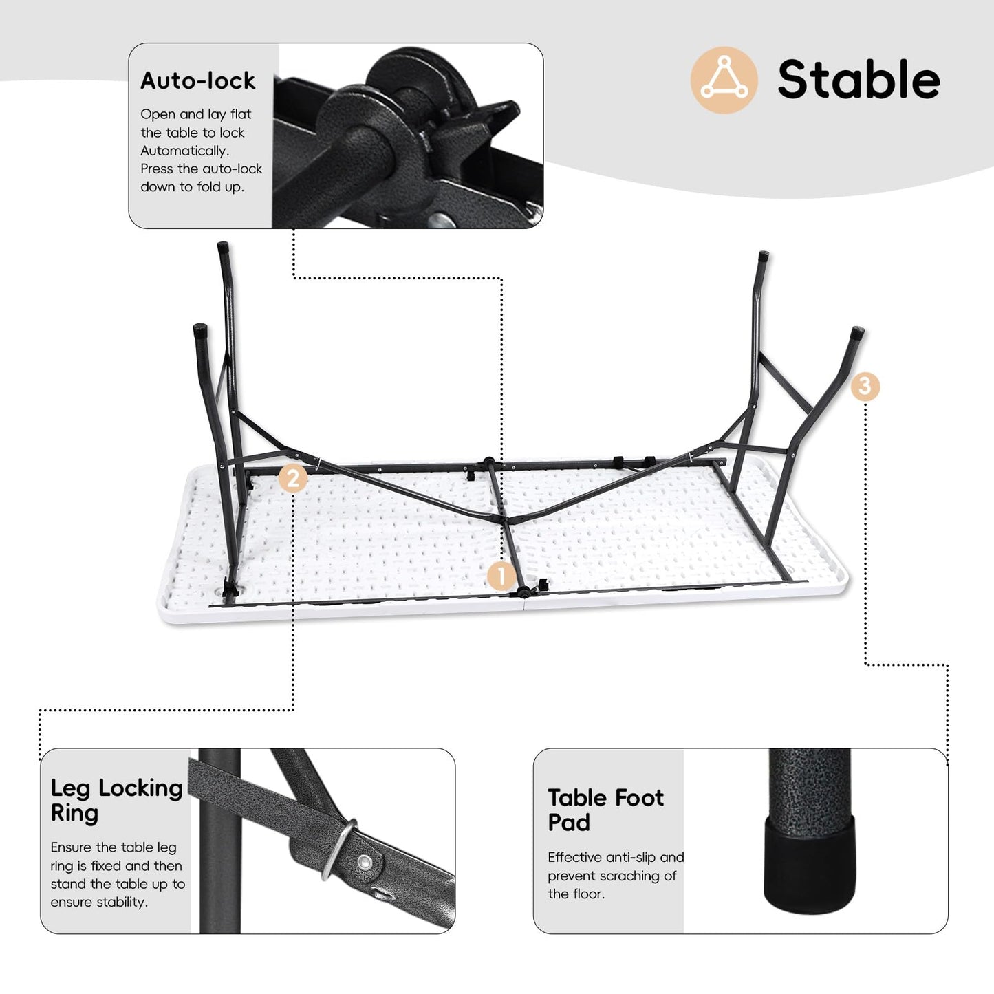 - HIGH-QUALITY MATERIALS: The portable folding table uses thickened HDPE panels, which is more stable and easy to clean. The table legs are made of thickened steel pipes, which are rust-resistant and corrosion-resistant, and more stable