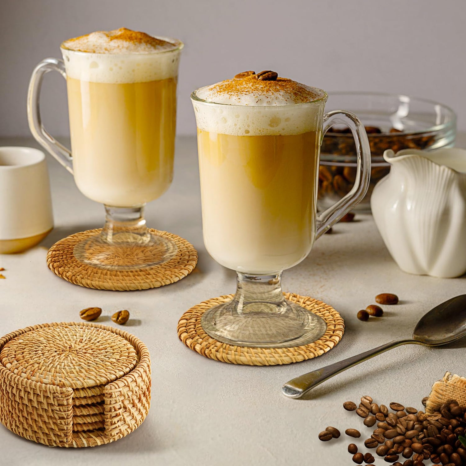 - Aesthetic & Functional: Each set includes 6 coasters and a holder, making it perfect for your boho or farmhouse accent room, kitchen, and office. The woven coasters are suitable for glass cups, coffee cups, wine bottles, beverage cans, etc. When not in use, neatly store them in the matching natural rattan woven holder for both convenience and aesthetics.