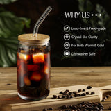 [ 6pcs Set ] Glass Cups with Bamboo Lids and Glass Straw - Beer Can Shaped, 16 oz Iced Coffee Drinking Glasses, Cute Tumbler Cup for Smoothie, Boba