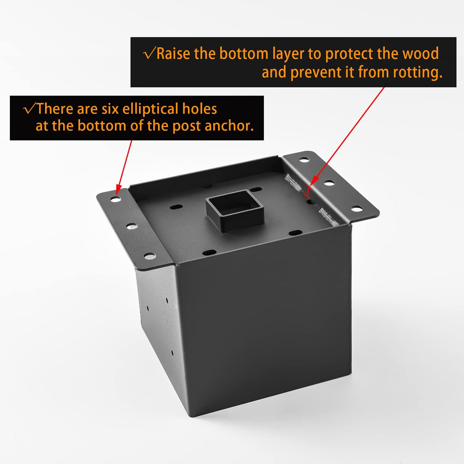 - Heavy Quality Steel] The post base bracket is made of 2mm thick high-quality Q235B steel, high-strength welded structure, black outdoor powder coating, solid and durable, anti-corrosion and rust prevention.