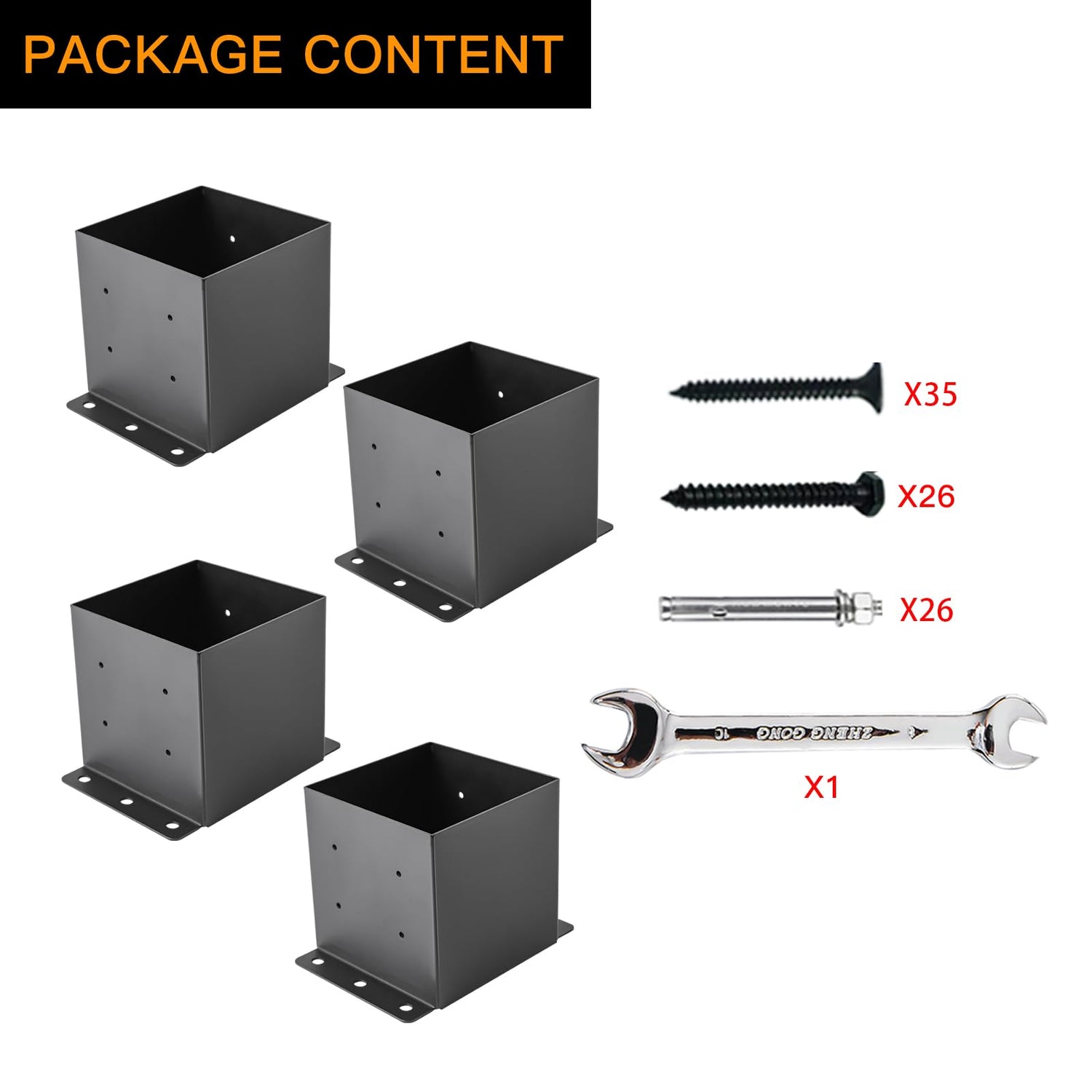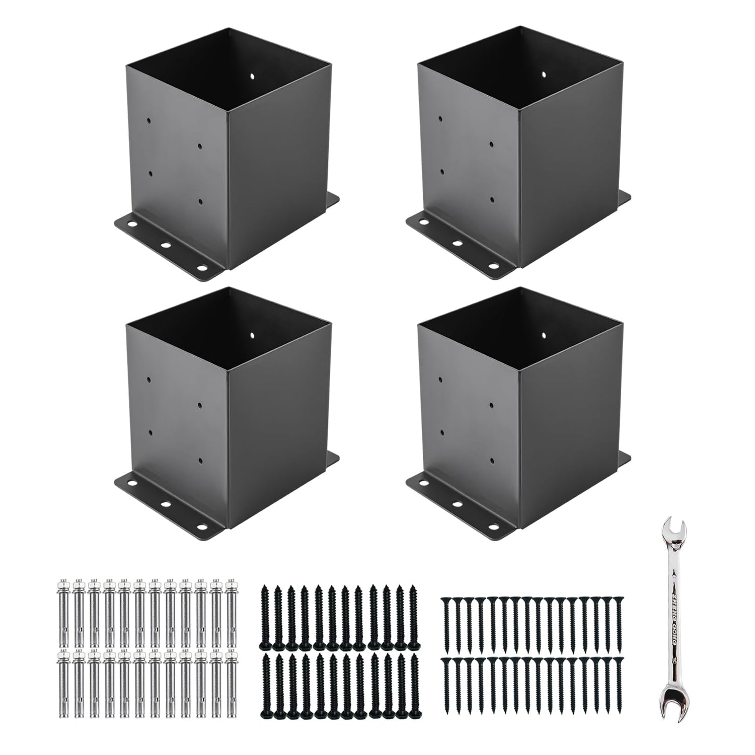 - [Easy To Install] Provide a simple installation manual. The accessories include 1 wrench, 24 expansion bolts, 24 external hexagon internal cross self tapping screws and 32 self tapping screws. You can firmly fix the post base on the wooden floor or concrete floor as required.