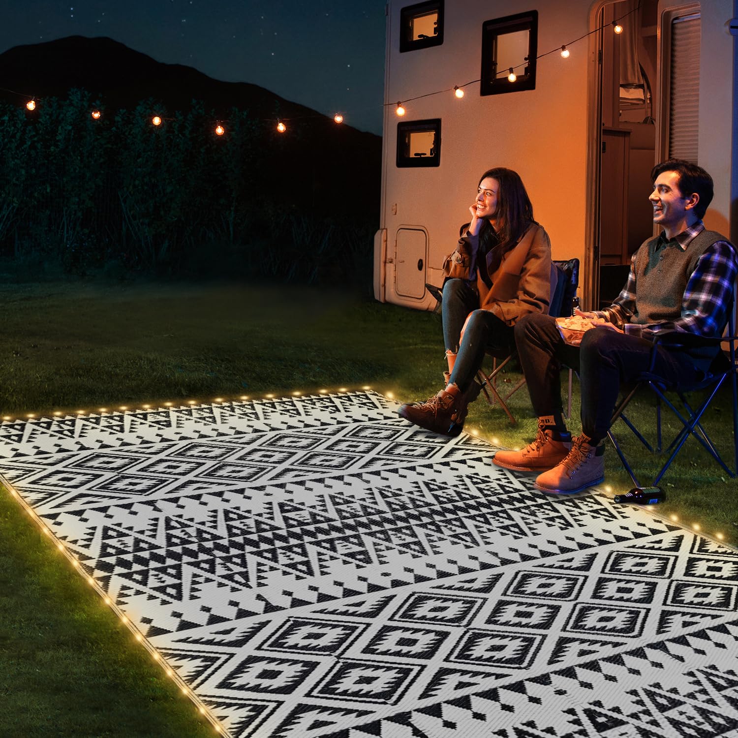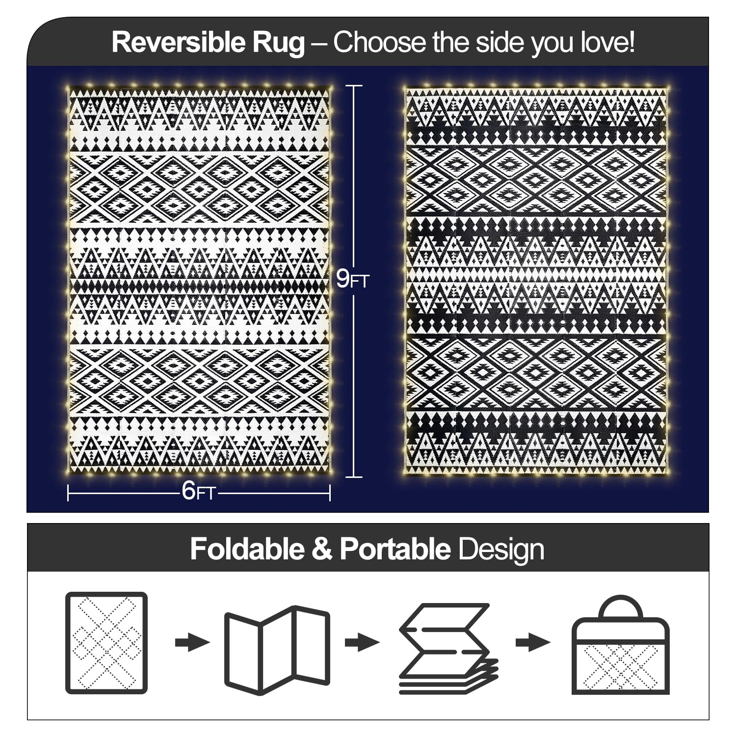 6x9ft Waterproof Outdoor Rug with LED Lights, Bohemia Reversible Plastic Straw Mat for Patio RV Camping Picnic Balcony Beach Deck Indoor Outdoor Carpet, Black&White