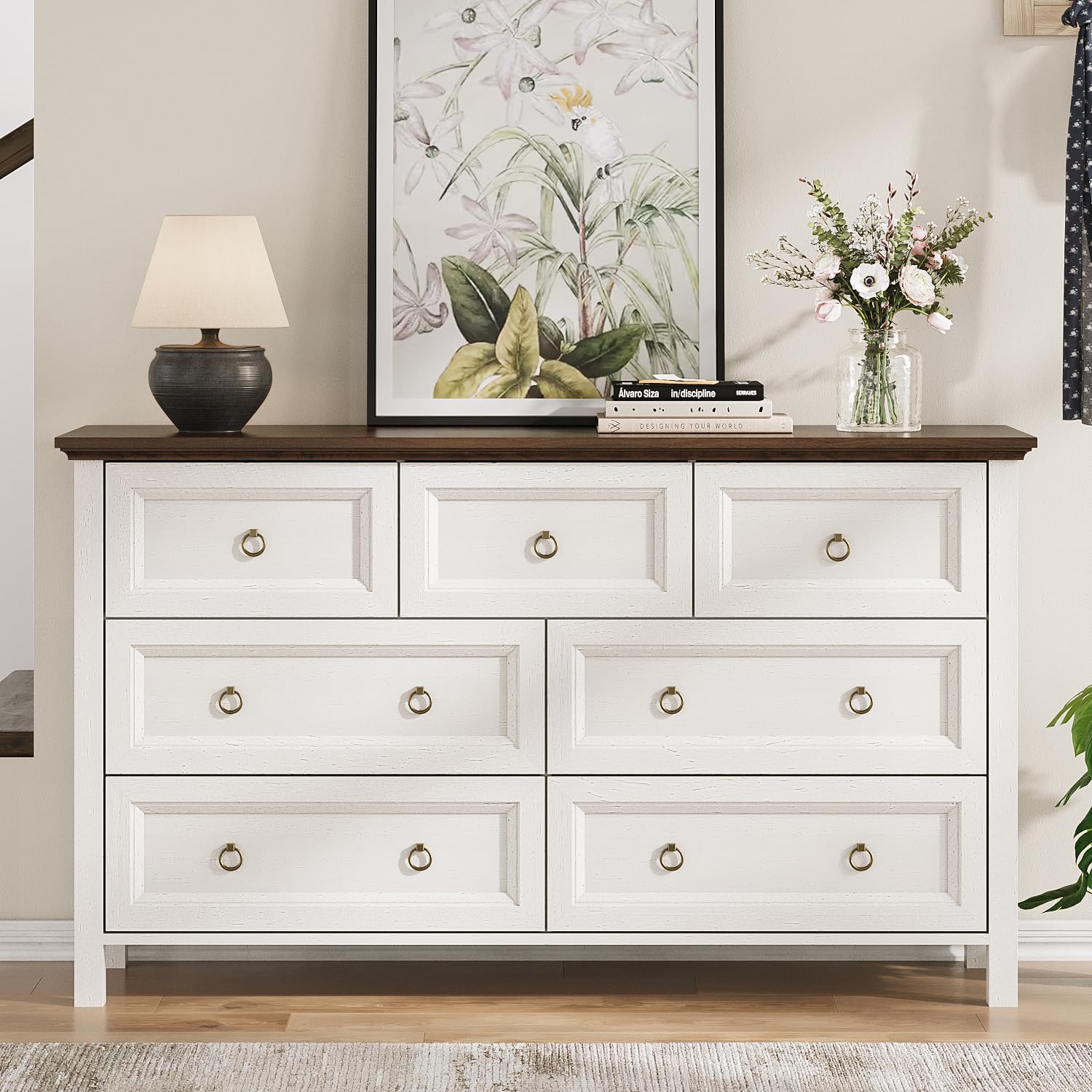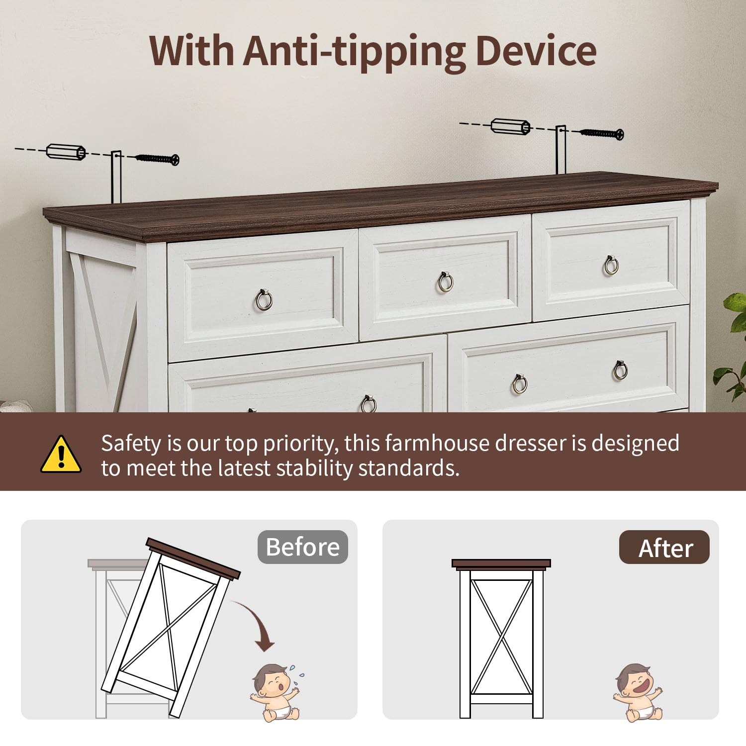 - 【Farmhouse Bedroom Dresser】Our beautifully crafted 7 drawer dresser embraces the charm of a rustic farmhouse aesthetic. The combination of a rich brown tabletop and a white body, accentuated by barn door-style side panels, brings a touch of countryside warmth to any room. The dresser is further enhanced by round metal drawer pulls in an antique brass finish, adding a hint of vintage French country style.