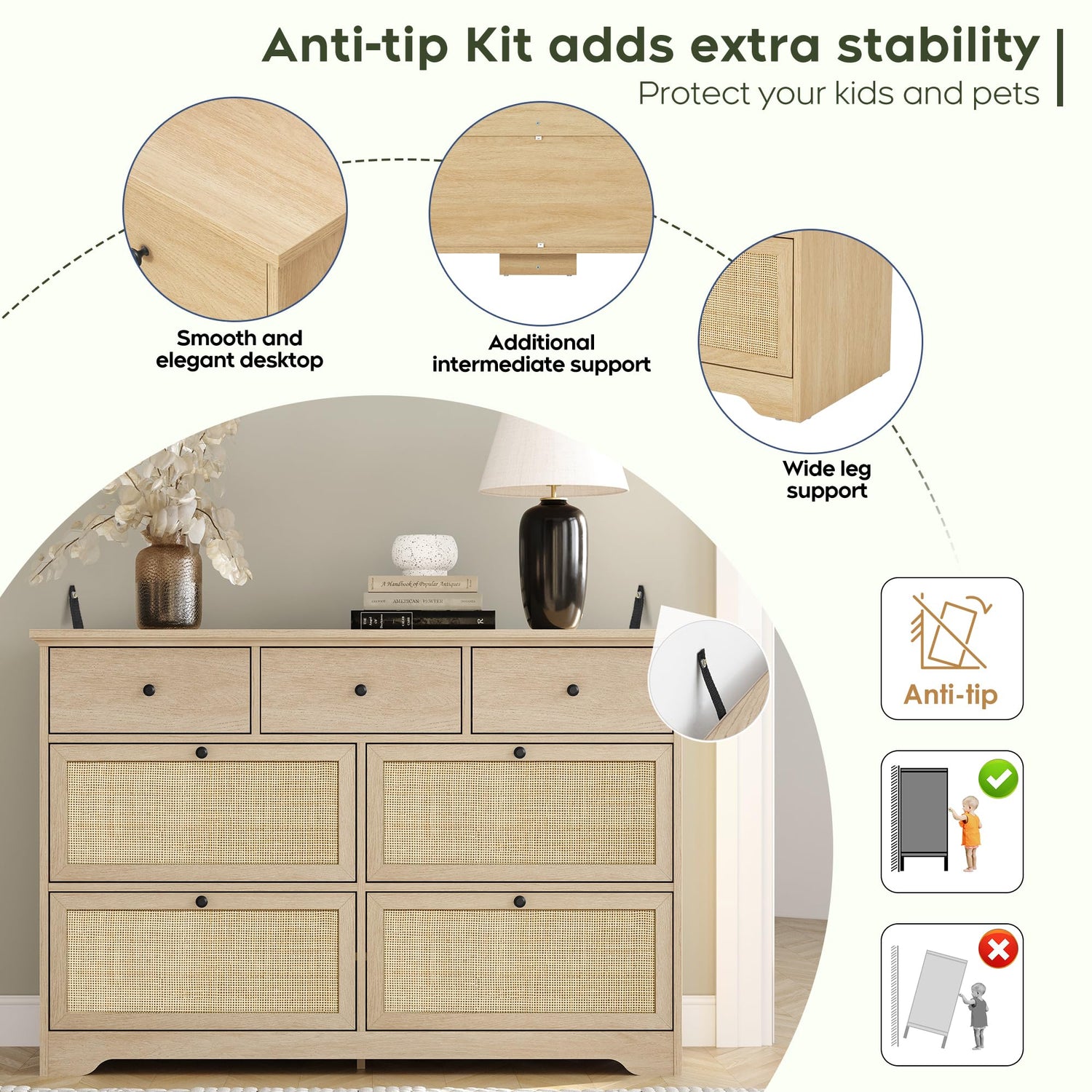 7 Drawers Natural Rattan Dresser for Bedroom, Mid Century Modern Dresser Wooden Cane Dressers with Elegant Tabletop, Boho Drawer Dresser TV Stand with Sturdy Base for Living Room, Kids Room, Nursury
